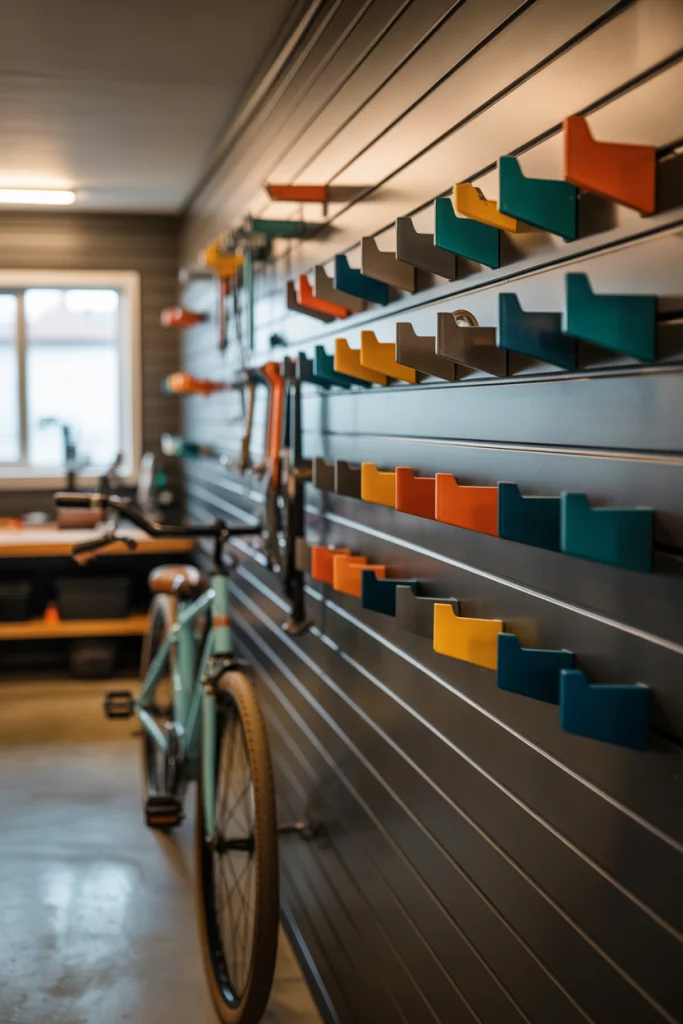 Turn your wall into a flexible tools workshop with Ikea-style slatwalls or traditional pegboards. Hang tools, garden gear, cords, and even bikes in a cheap, easy diy way. Choose colorful hooks and shelves to match your modern garage theme. This idea works beautifully in any small space, adding structure and convenience without breaking a budget.