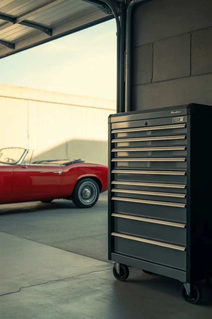 A rolling cabinet brings mobility and organization to your workshop. Keep all your storage tools in drawers and trays that move wherever you need them. In a 2 car garage, you can roll it aside when parking your car. This setup gives off a professional mechanic vibe while staying affordable and easy to maintain.