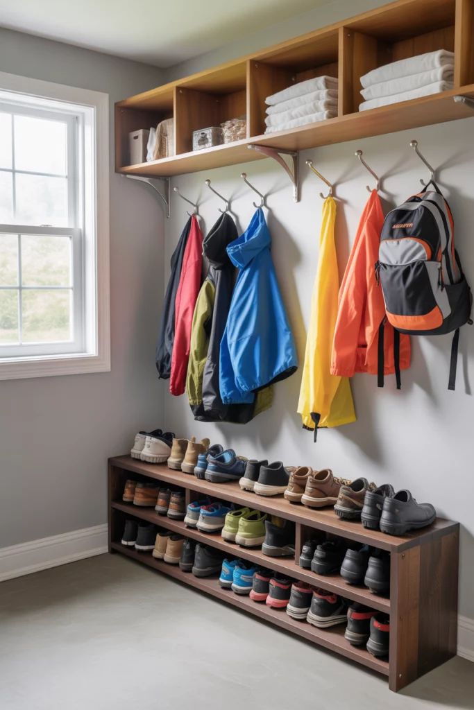 Turn part of your garage into a mini mudroom. Use a sturdy shoe rack and cubbies for shoes, boots, and sports gear. Add hooks for jackets and bags, keeping the space clean and practical. This easy diy setup is cheap, modern, and perfect for families on a budget who want order near their workshop entrance.