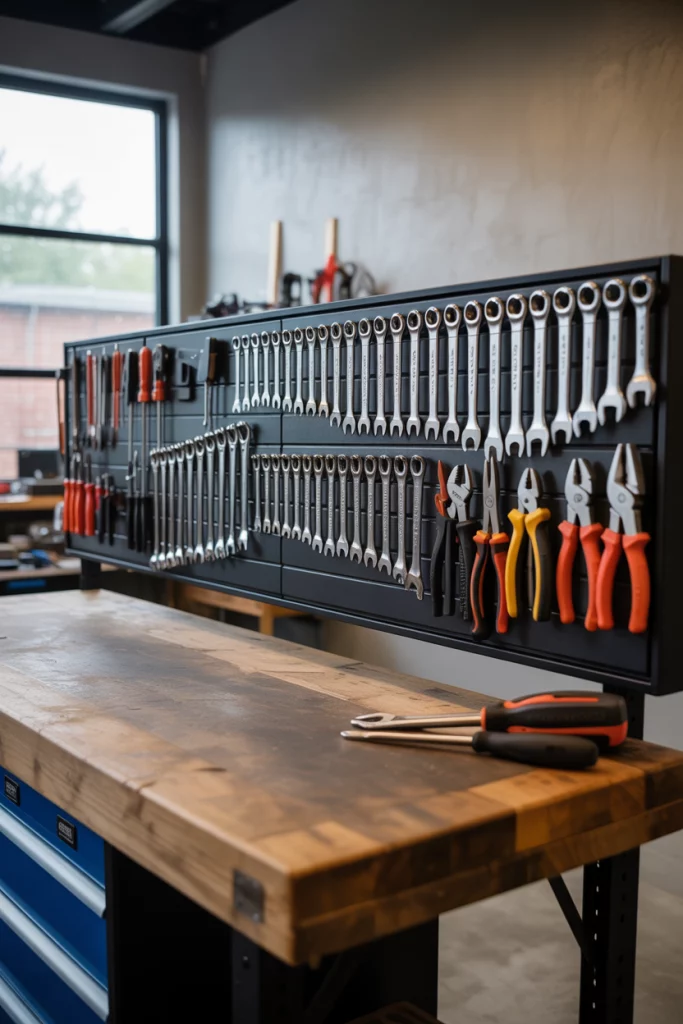 For a mechanic or tools workshop, add magnetic strips to the wall. They’re cheap, easy diy, and highly functional for keeping tools like screwdrivers and wrenches visible yet organized. This solution turns an ordinary garage into a sleek modern workspace with instant access to everything.