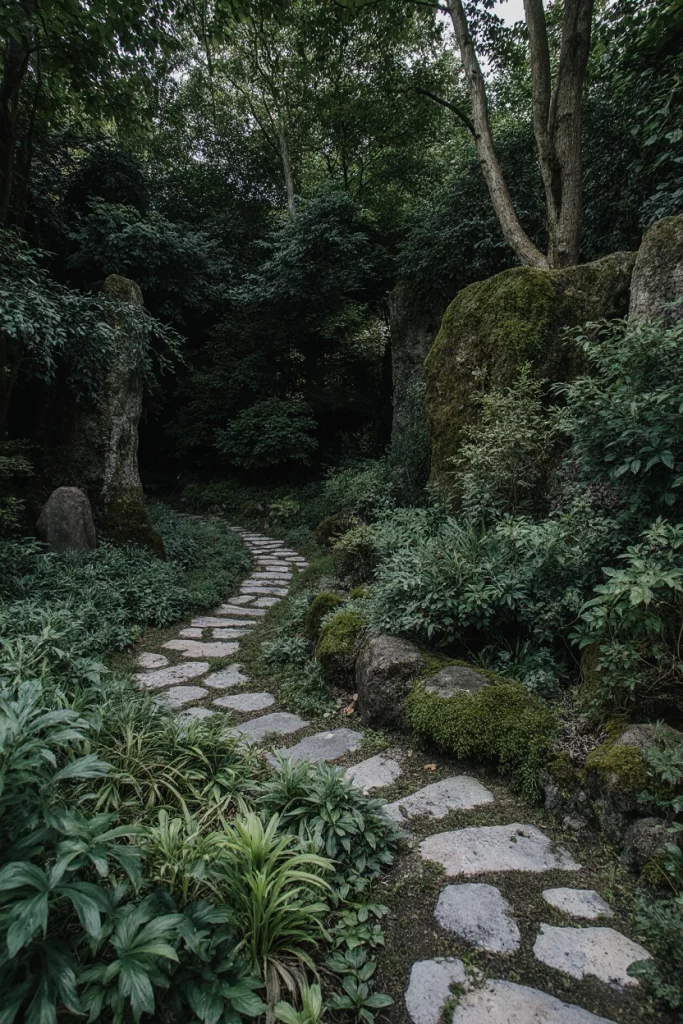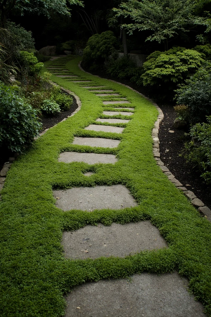 A Japanese moss pathway introduces softness and a quiet mood to shaded backyard corners. Moss thrives in humidity and low light, making it perfect for dense, tree-covered zones. Paired with stepping stones and subtle curves, the pathway feels meditative and timeless. Designers note that moss gardens create a gentle sensory experience, ideal for homeowners wanting a slow, reflective landscape element.