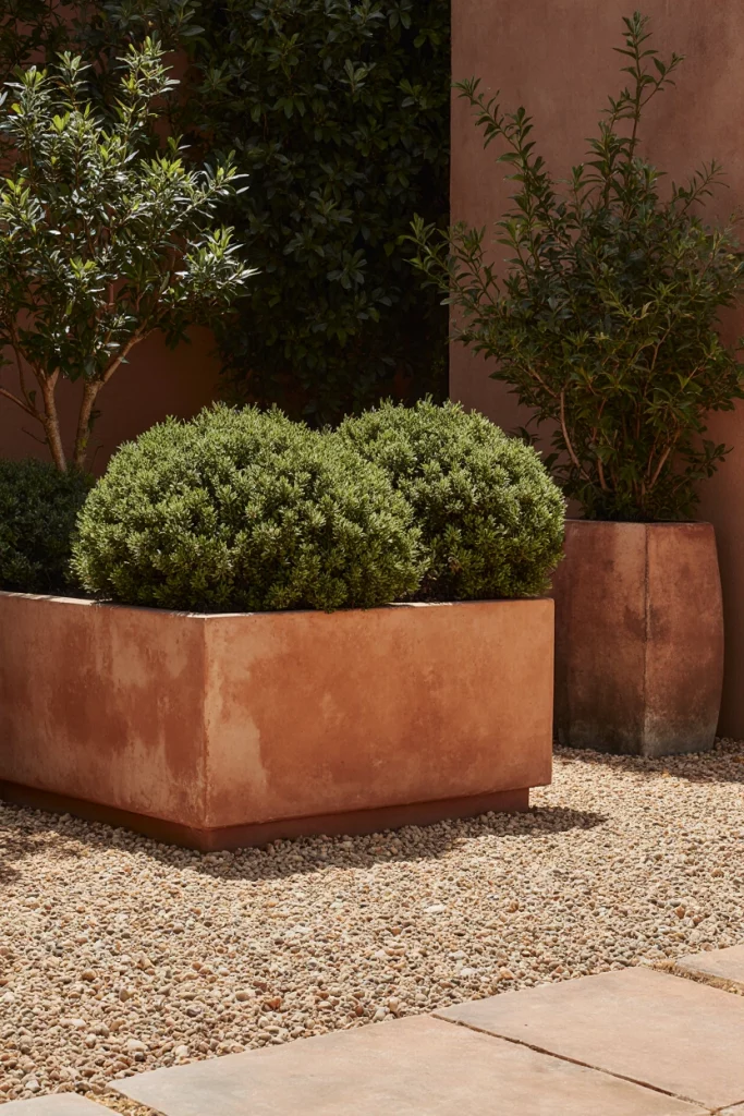 A Mediterranean gravel courtyard brings texture and warmth to home exteriors without demanding heavy maintenance. Layered gravel, terracotta accents, and sun-loving shrubs create a relaxed, breezy feel that pairs well with outdoor dining areas. This approach works for front yard and backyard upgrades where drought-friendly comfort is essential. Inspired by Southern European villas, the style blends rustic charm with modern livability.