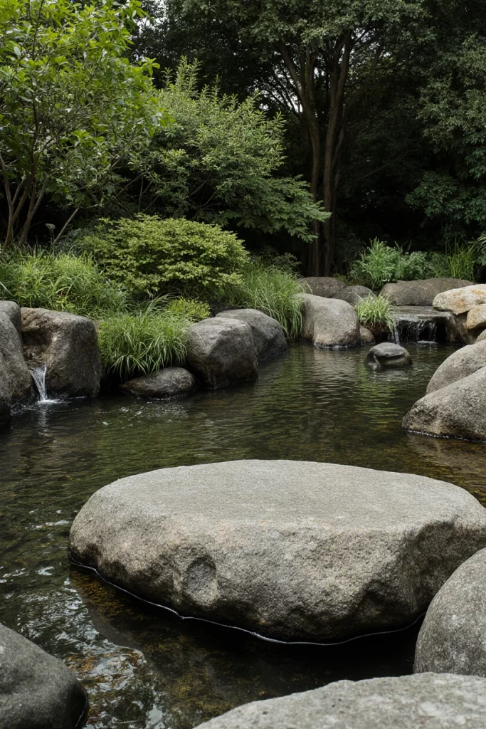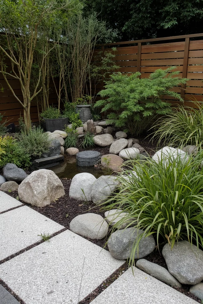 Inspired by Zen traditions, a small water basin creates a grounding focal point in courtyards or entry gardens. Using stone, rippling reflection, and surrounding greenery, the feature encourages quiet pauses and contemplation. This idea suits minimalist or modern homes wanting subtle emotional depth. Designers note its calming influence even in busy urban neighborhoods.