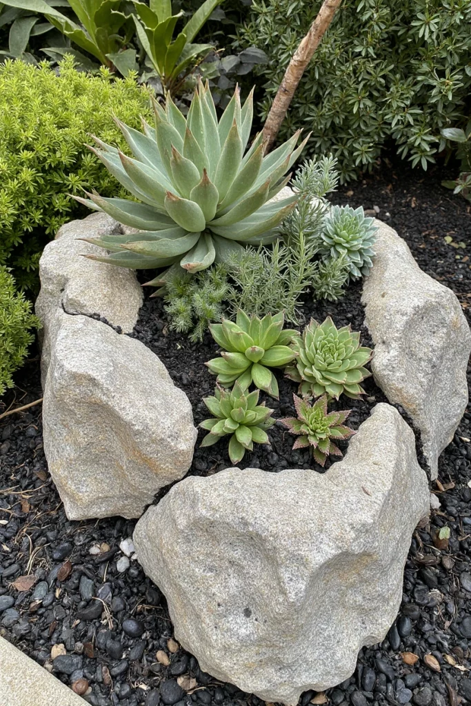 Small succulent stone pockets are ideal for tiny gardens, patios, or steps where planting space is limited. Using carved stone holes or stacked rock crevices, homeowners can curate hardy plants in sculptural displays. This approach suits modern and rustic outdoor styles alike and requires very little maintenance. The design works beautifully in dry climates or sunny balconies.