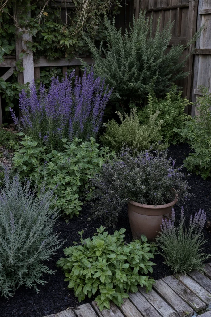 A moody, witch-inspired herb nook features sage, lavender, rosemary, and dark-leaved plants arranged in nostalgic clusters. This style blends cottage charm with mystical undertones, appealing to homeowners who enjoy character-rich gardens. Paired with stone accents or vintage pots, the look becomes both practical and expressive. It suits shaded and semi-shaded spaces particularly well.