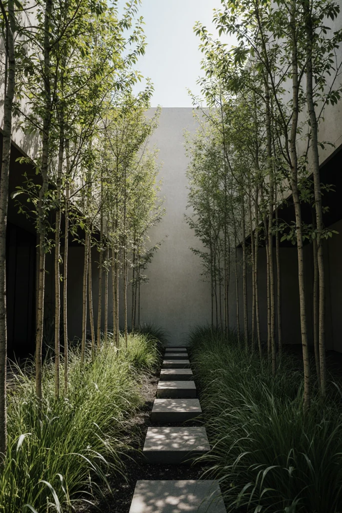 A vertical courtyard forest uses tall grasses, slim trees, and layered greenery to build height in small courtyard spaces. This layout creates the illusion of depth while keeping the footprint compact. Designers appreciate how it softens architectural edges and transforms even narrow passages into lush retreats. The style fits modern homes that want nature woven into structural space.