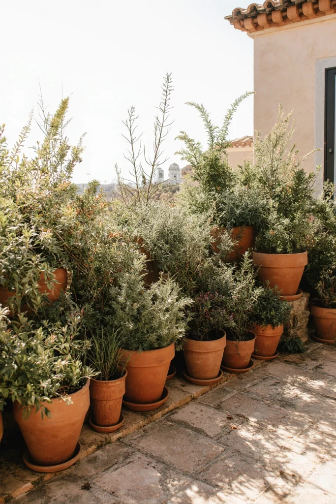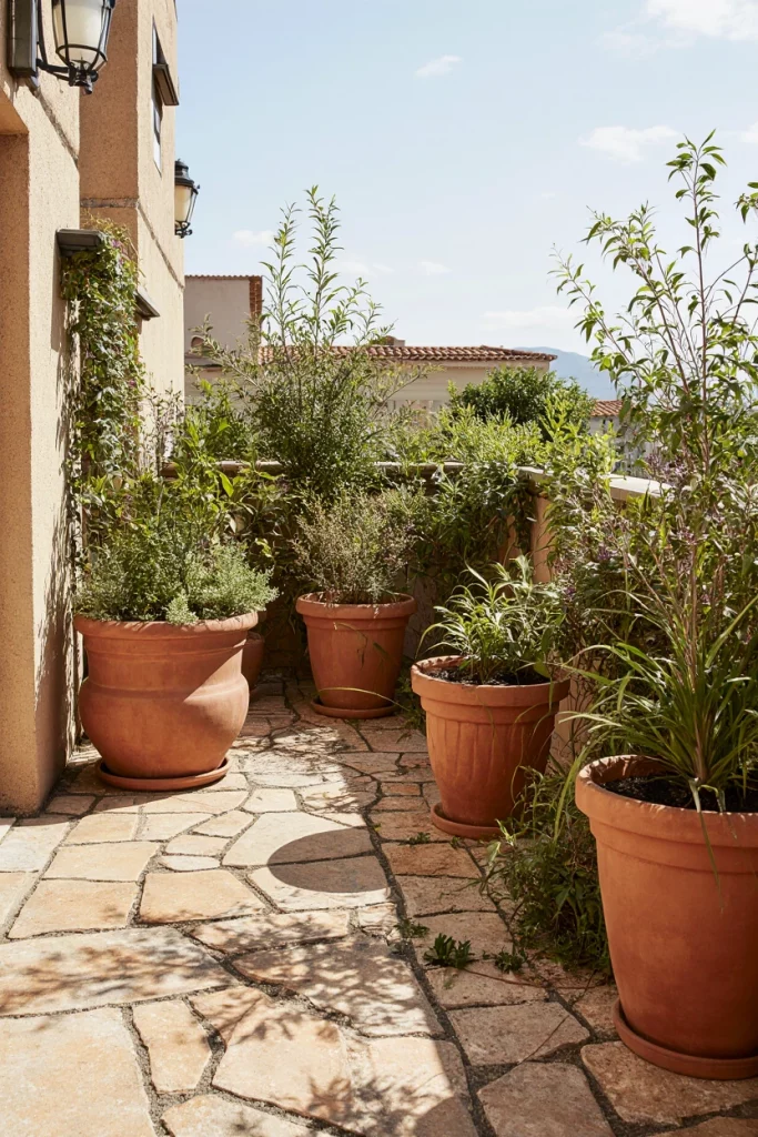 A terrace styled with Mediterranean warmth creates a sun-filled escape right at home. Terracotta pots, herbs, olive trees, and soft stone textures make this idea perfect for rooftop spaces or backyard decks where sun exposure is strong. Designers recommend drought-tolerant planting plans, making the space beautiful and low-maintenance. The look blends rustic charm with relaxed comfort.