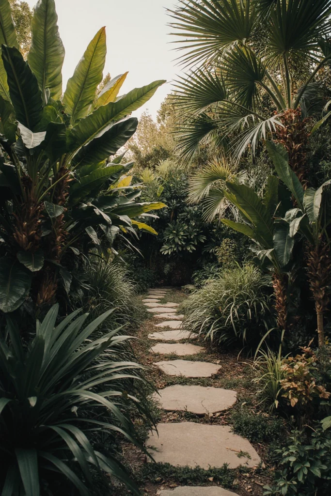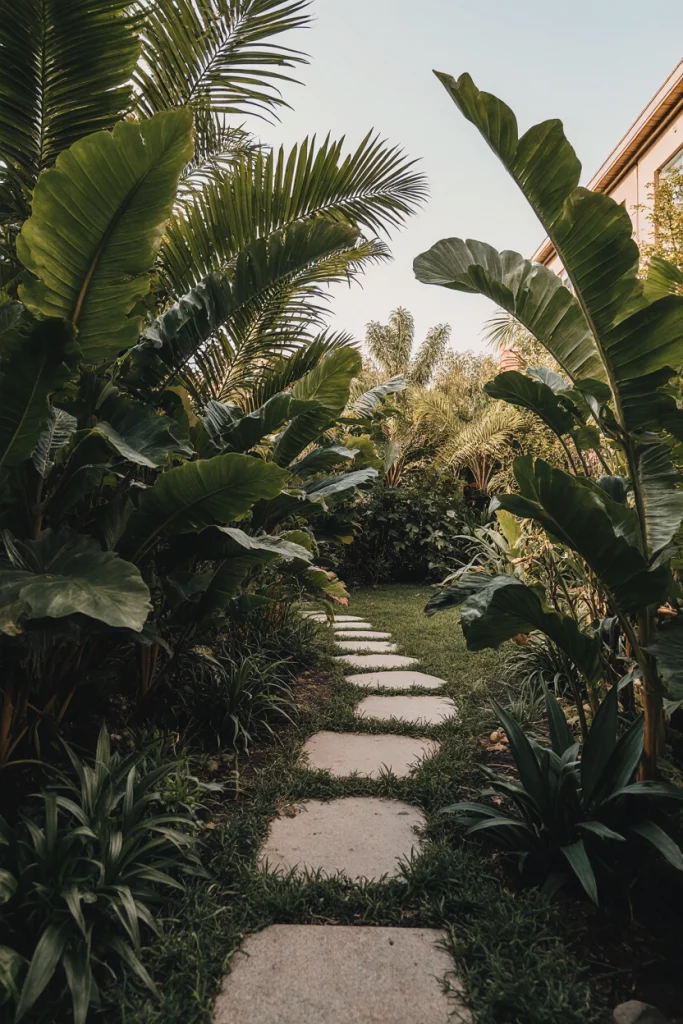 A lush tropical garden brings bold greenery and a sense of escape into the backyard. Large leaves, layered canopy plants, and moisture-loving textures make even small yards feel like private retreats. This style thrives in warm climates and pairs nicely with stone steps or wooden accents. Designers highlight its ability to make everyday outdoor moments feel like a vacation.