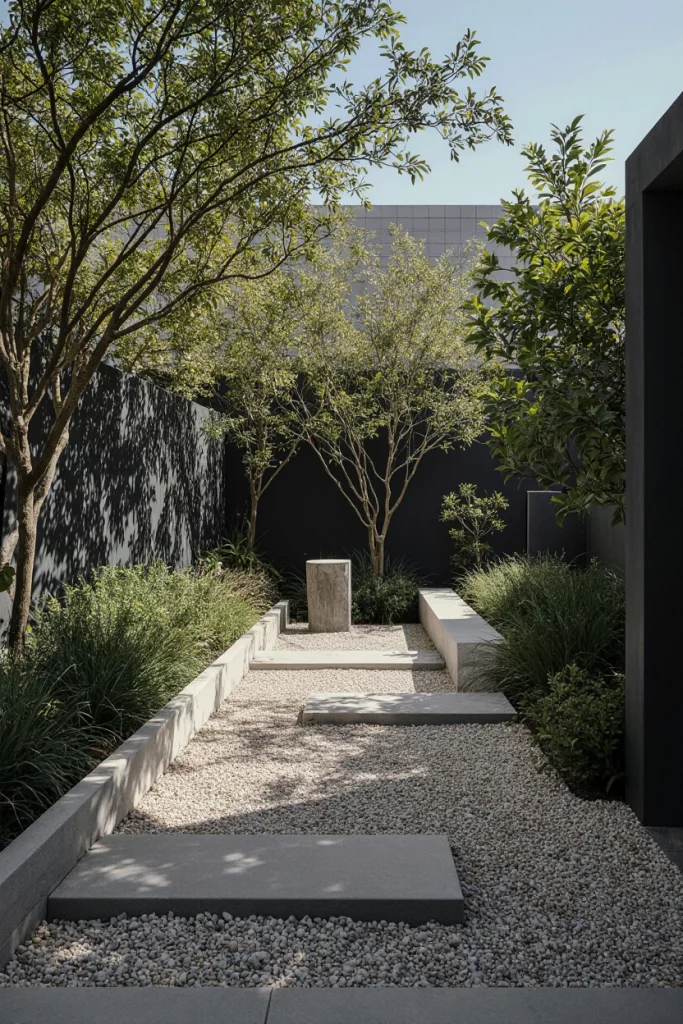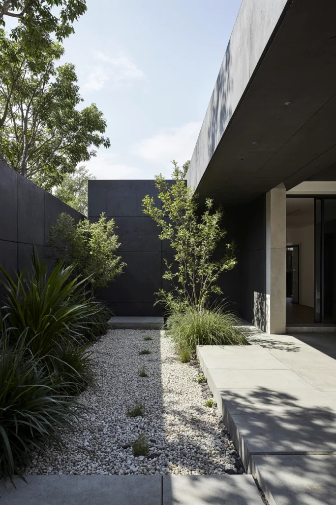 A courtyard with modern lines feels calm, intentional, and sculptural. Gravel, concrete, and carefully selected plants—like structural grasses or succulents—create a soothing environment that suits both small and large homes. Designers often use this approach for spaces enclosed by walls, where simplicity has more visual impact than traditional garden density.