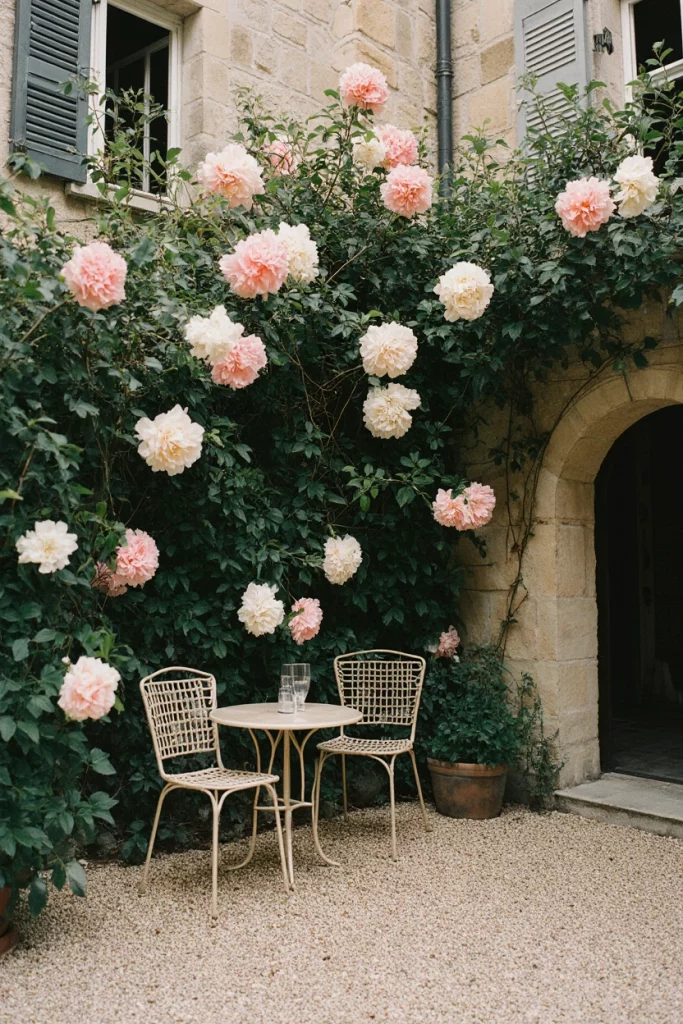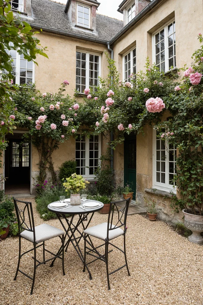 A French courtyard with cascading rose varieties brings timeless romance to compact outdoor areas. Gravel underfoot, bistro seating, and symmetrical lines give the style its refined simplicity. It’s especially effective in townhomes or smaller entry courtyards where an intimate, elegant look is desired. Designers praise its ability to elevate simple spaces.