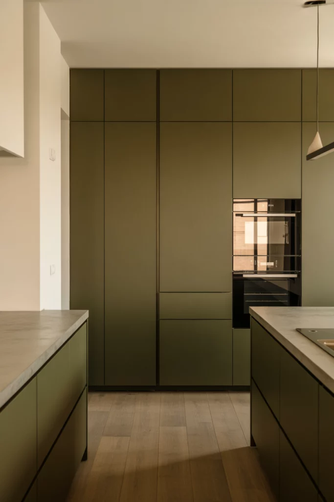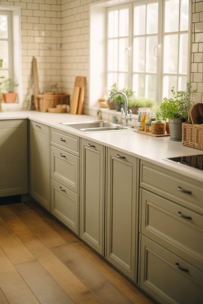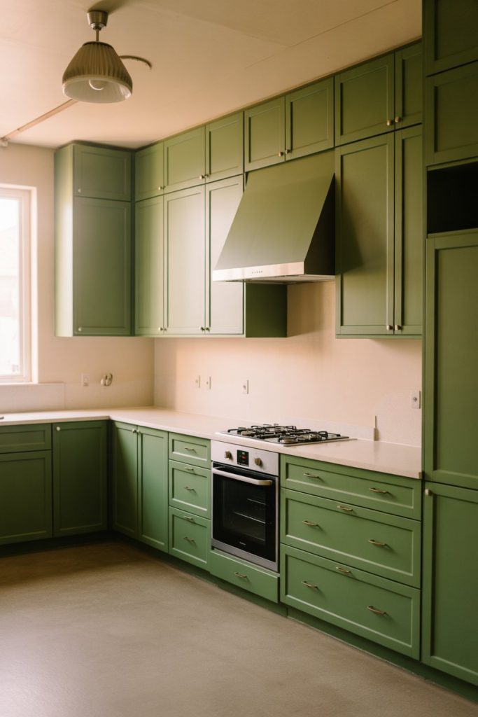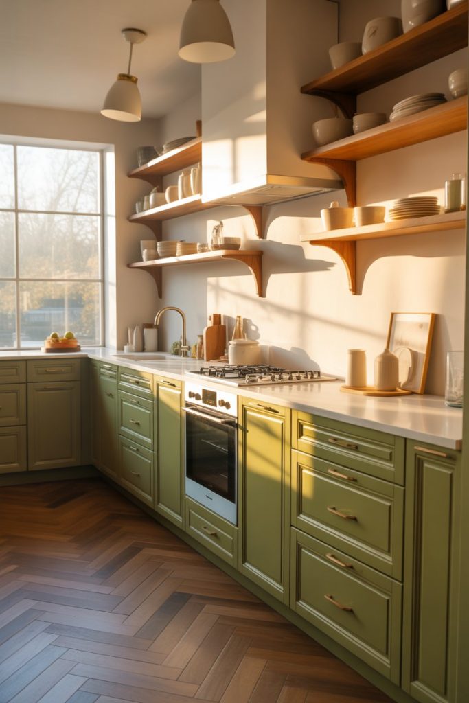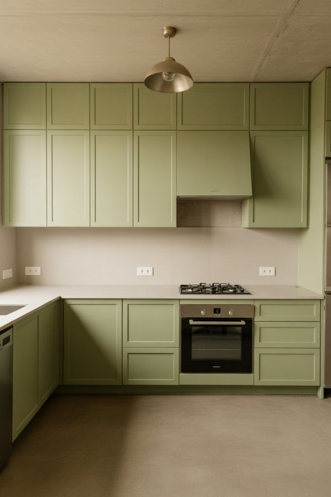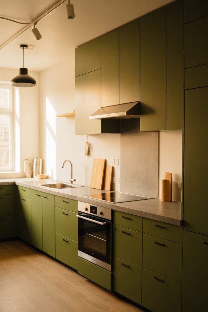 Modern olive kitchens strip away ornate details in favor of clean lines and streamlined forms. Flat-panel cabinets in muted olive tones, paired with integrated handles or slim metal pulls, create a look that’s contemporary without being cold. This aesthetic appeals to younger homeowners who want color but aren’t interested in traditional or farmhouse styles. The modern approach lets the green speak for itself, uncluttered by decorative moldings or busy backsplashes.
