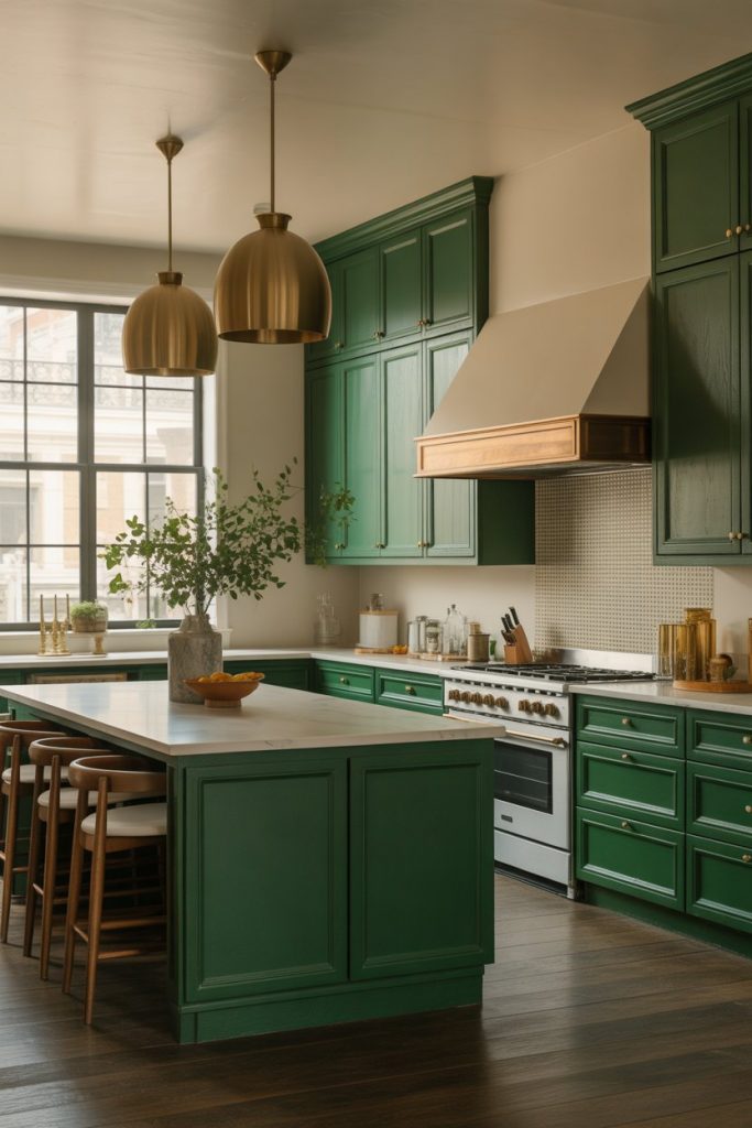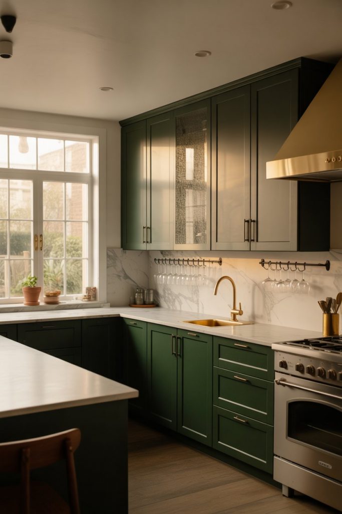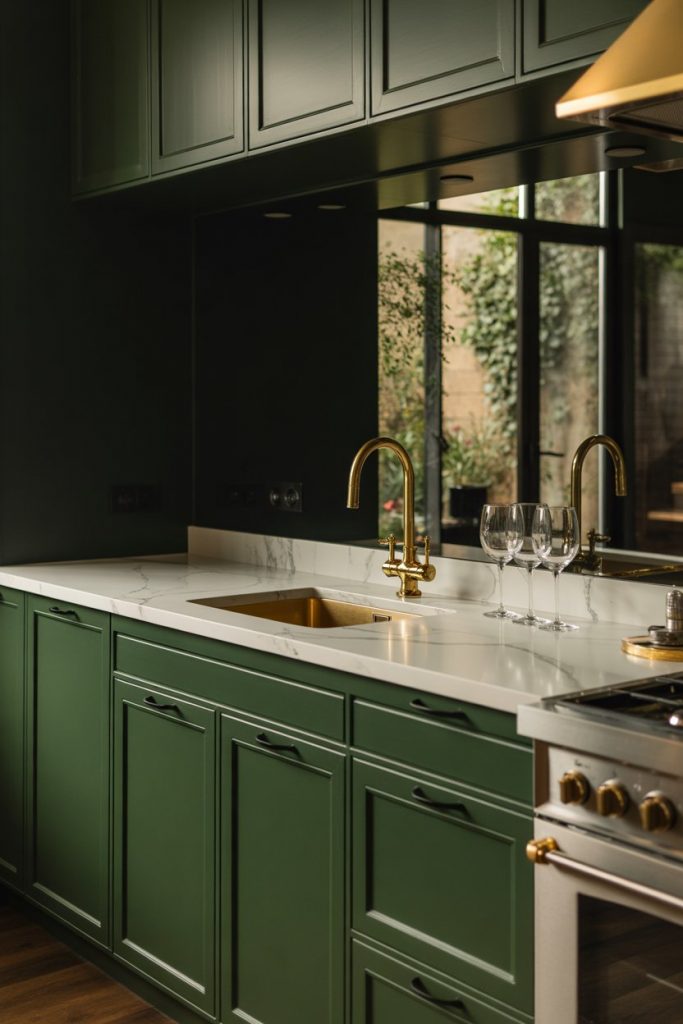 Dark green cabinets—think forest or hunter tones—bring drama and richness that lighter greens can’t match. This luxury approach works beautifully in large kitchens with ample natural light, where the depth of color creates an enveloping, jewel-box effect. Paired with white or gray marble countertops, the contrast is striking yet balanced. These kitchens feel curated and intentional, like spaces designed for serious cooking and gracious entertaining rather than quick weeknight meals.