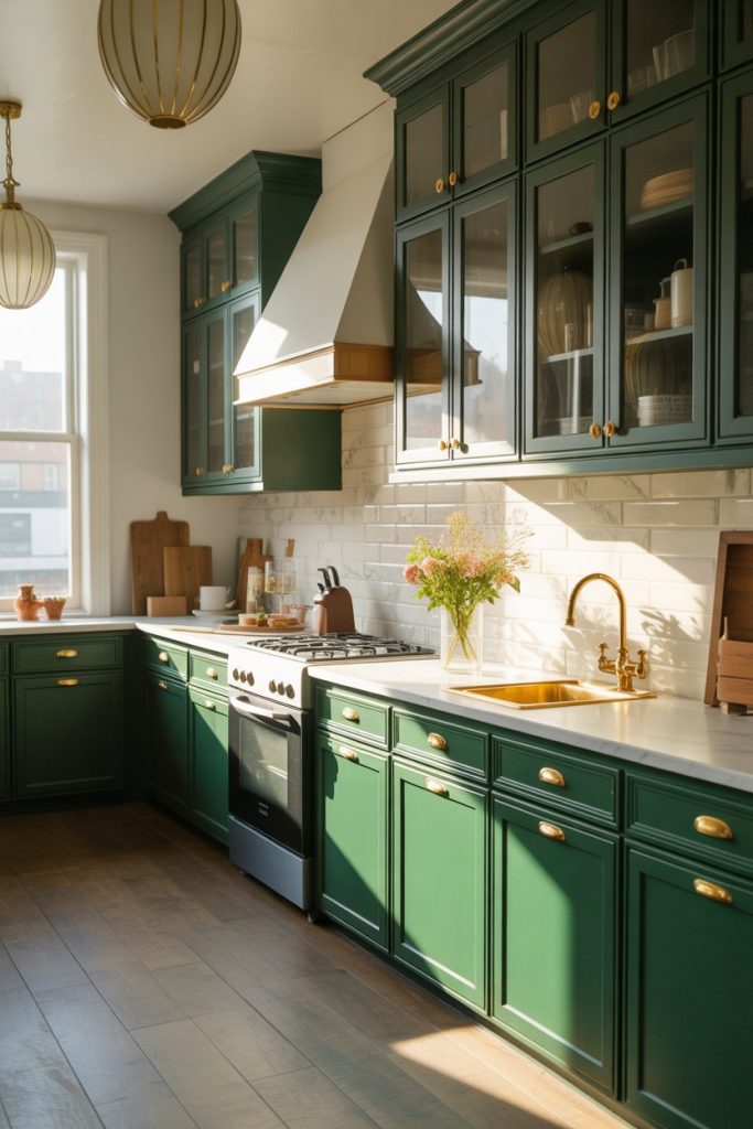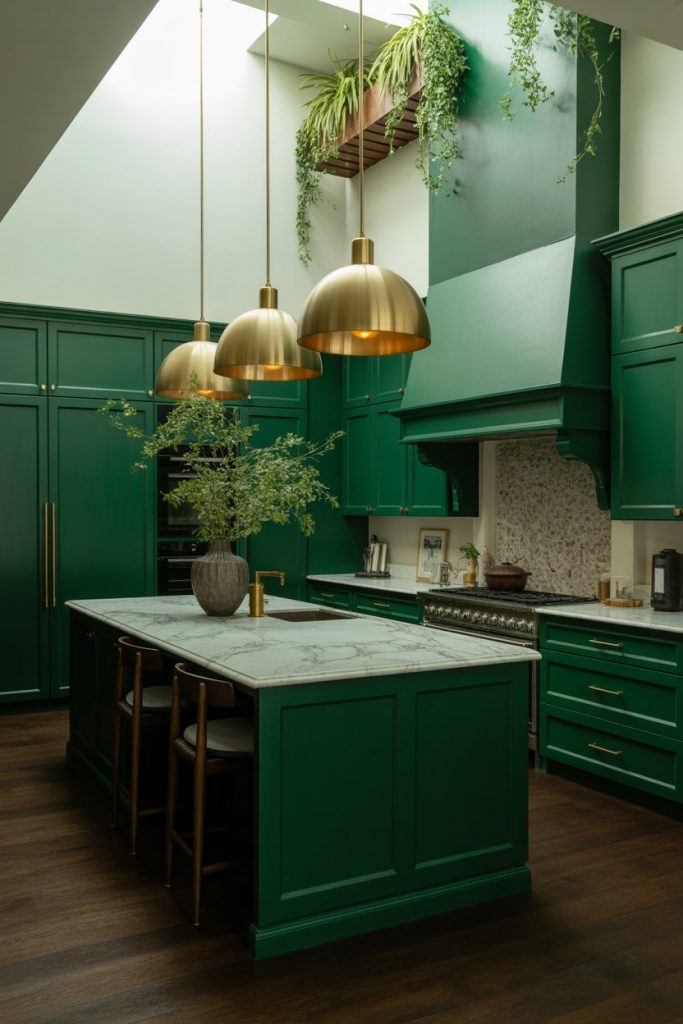 Where this works best: in homes with distinct architectural character—Victorian townhouses, art deco apartments, or even carefully detailed new builds where dramatic choices feel intentional rather than impulsive. One consideration is lighting: emerald needs abundant light to avoid feeling cave-like, so this works better in kitchens with multiple windows or excellent artificial lighting. The combination also requires commitment to keeping complementary colors in check—too many competing hues and the space becomes chaotic rather than cohesive. But when executed well, emerald and gold kitchens are showstoppers.