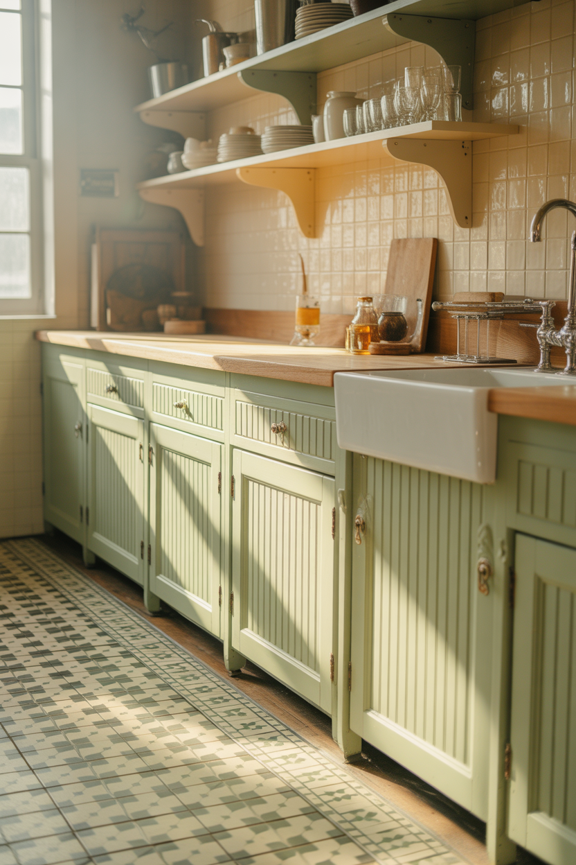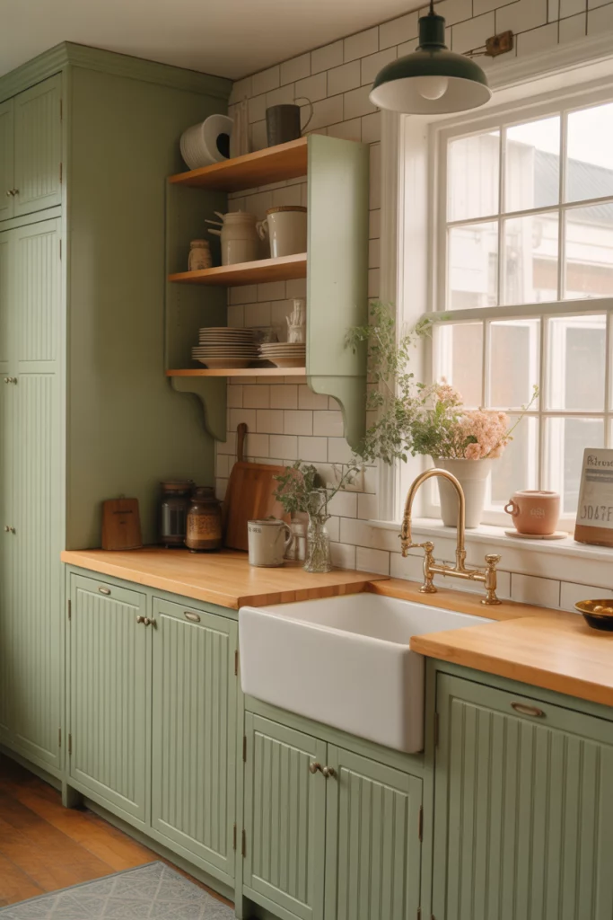 Vintage green kitchens pair beautifully with classic farmhouse sinks, creating a look that’s equal parts practical and romantic. Apron-front sinks in white or cream provide a clean, traditional focal point against green cabinetry in any shade. This combination feels rooted in American kitchen history—when sinks were furniture pieces as much as fixtures, and kitchens were designed to last generations rather than follow trends. The appeal is both aesthetic and emotional: these kitchens feel like home.