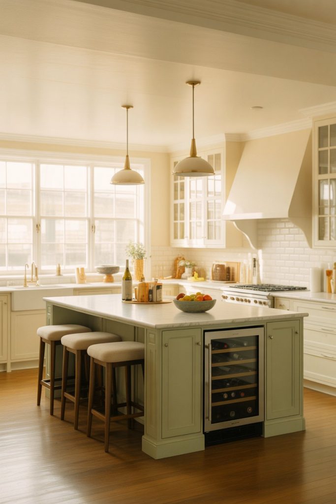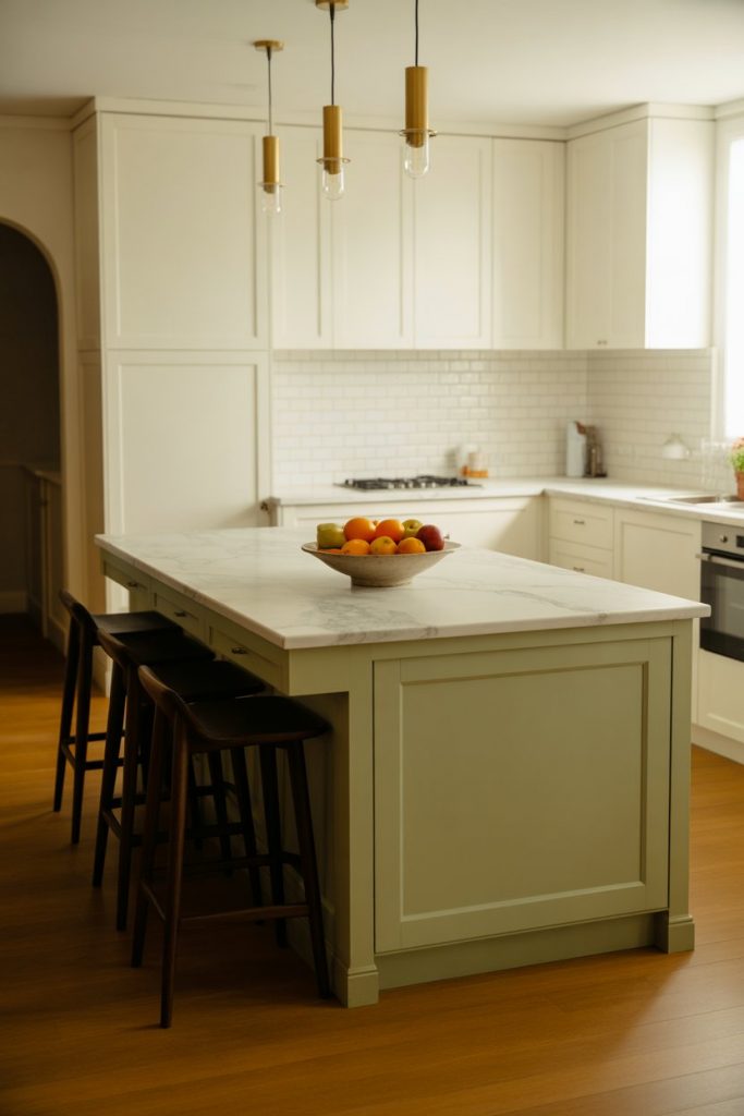 Where this works best: in kitchens with 10-foot ceilings or higher, where the island becomes a true centerpiece rather than getting lost in the room. Many homeowners make the mistake of painting only the island without considering hardware—matching or complementing the island’s finish with thoughtful pulls and knobs ties the whole kitchen together. Consider extending the green to a built-in bench or mudroom nearby to create visual continuity throughout your home’s main floor.