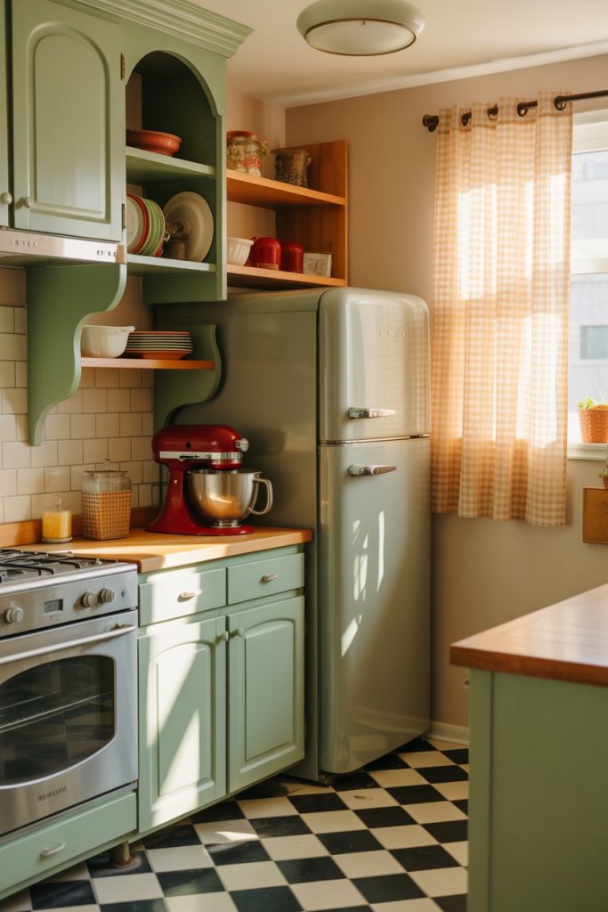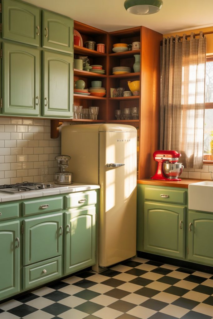 Mint green cabinets bring a playful, nostalgic quality that works beautifully in vintage-inspired kitchens. This shade evokes 1950s diners and midcentury modern homes, making it perfect for bungalows, cottages, and homes where retro charm is part of the appeal. Pair mint cabinets with checkerboard floors, chrome fixtures, and vintage-style appliances, and you’ve created a space that feels transportive—a kitchen that could exist in another era but functions perfectly for modern life.