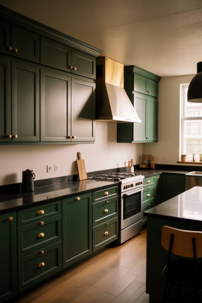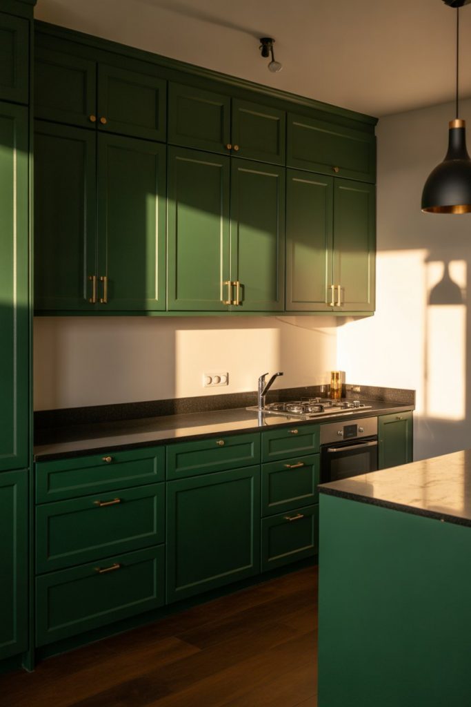 Green cabinets with black countertops create bold, graphic contrast that reads surprisingly sophisticated. Whether you choose dark forest green or a lighter sage, the black counters ground the space and provide a dramatic horizontal line that defines the kitchen’s geometry. This combination works particularly well in modern kitchens where clean lines and strong contrasts are valued, but it can also add contemporary edge to traditional spaces when executed with classic cabinet styles.