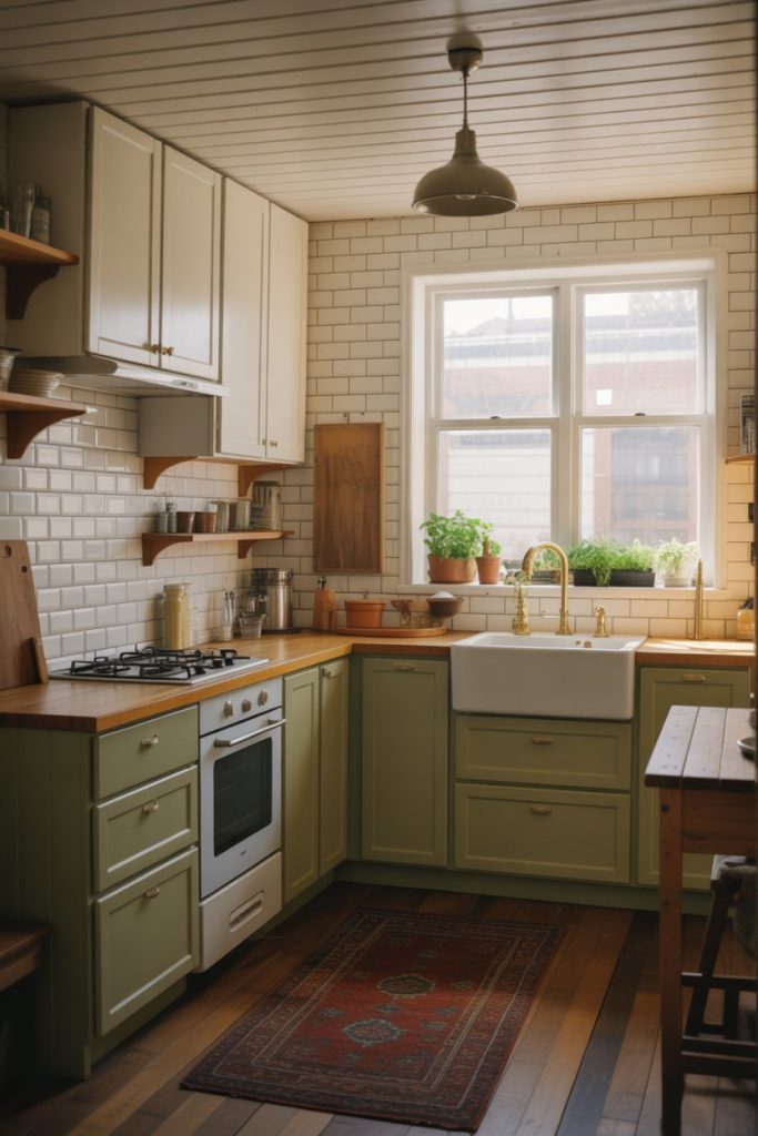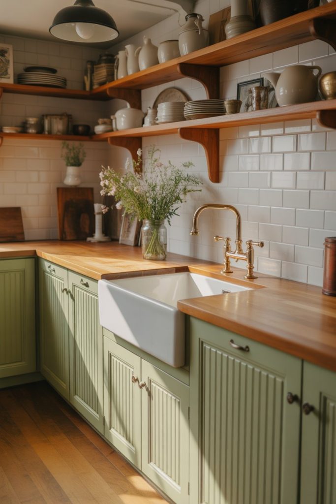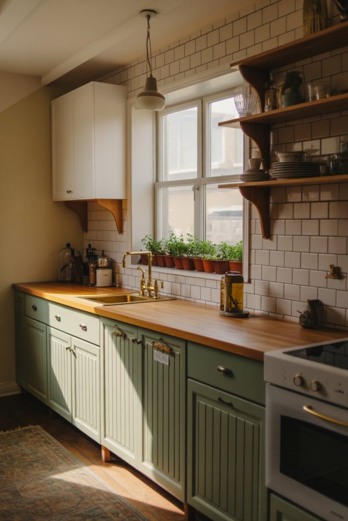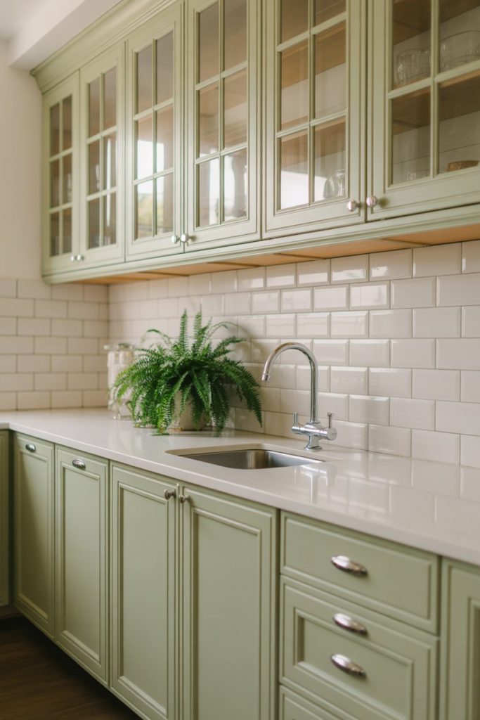 Sage green cabinets with classic white subway tile create a combination that’s both timeless and undeniably current. Subway tile’s clean geometry and glossy finish provide contrast to matte or satin cabinet paint, while the white keeps things bright and reflects light throughout the space. This pairing has staying power because it balances trend with tradition—sage is having a moment, but white subway tile has proven itself over more than a century. Together they create kitchens that feel fresh now but won’t look dated in ten years.