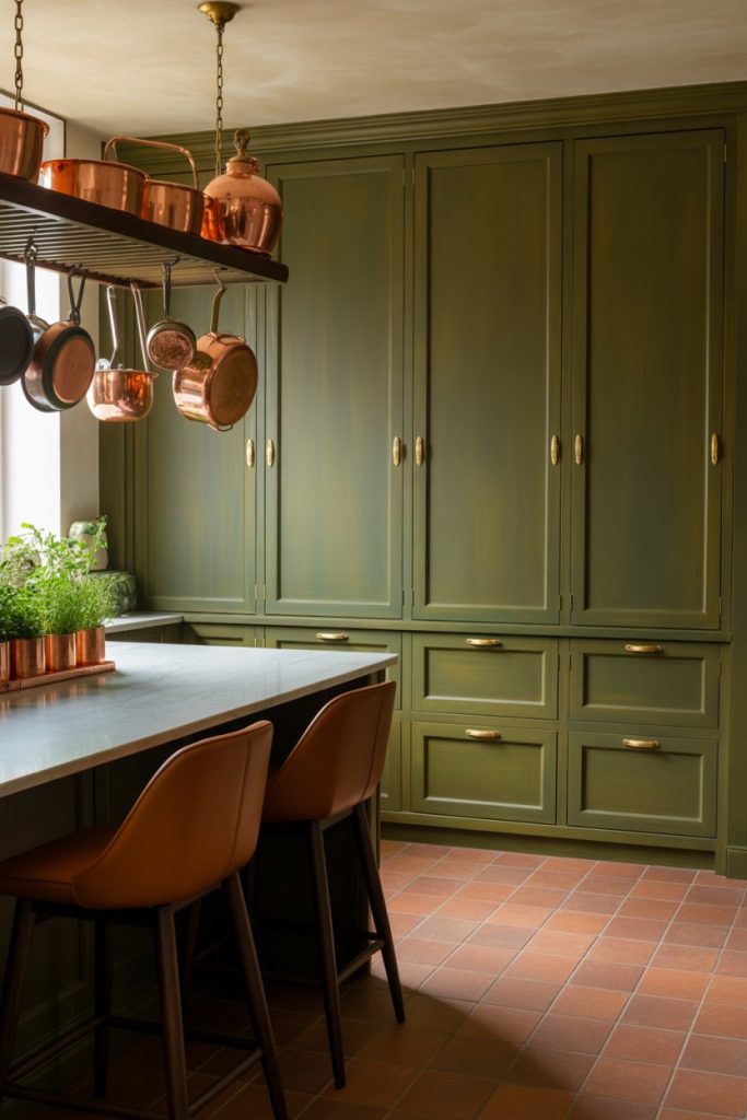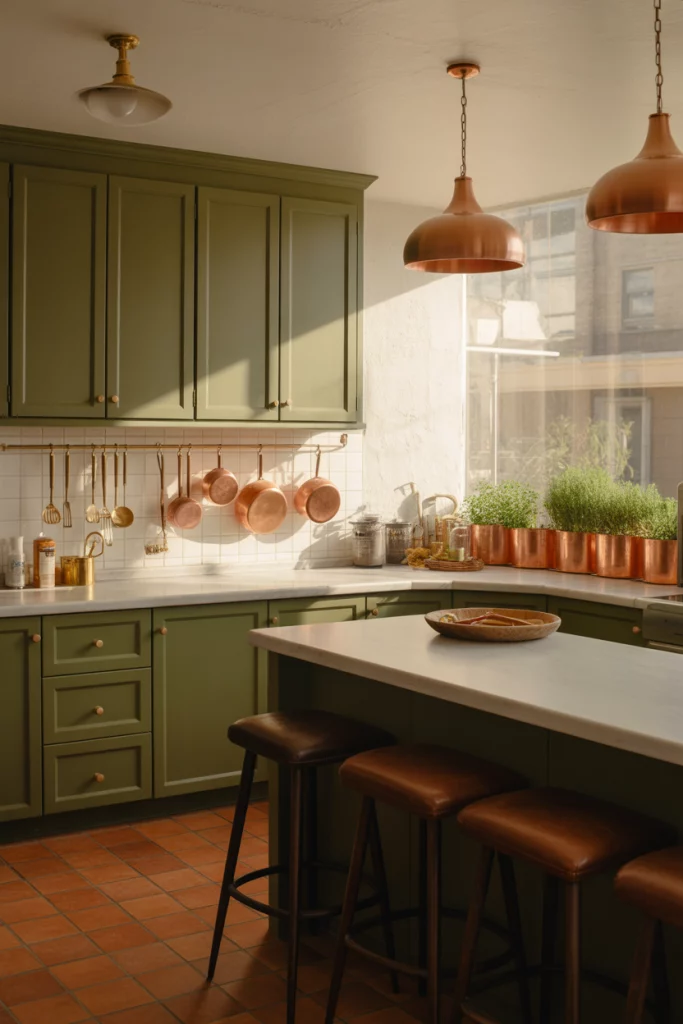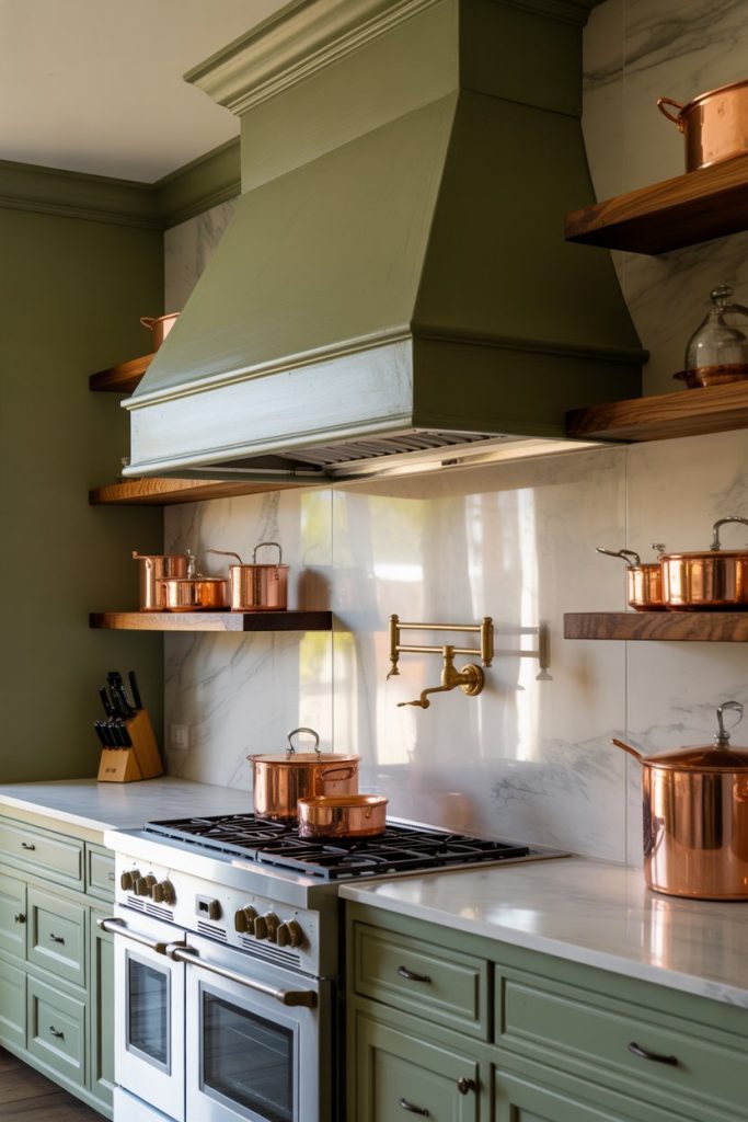 Building a color palette around green cabinetry becomes infinitely richer when warm metals enter the conversation. Brass and copper fixtures, hardware, and accessories add warmth that complements green’s natural undertones while introducing gleaming surfaces that catch and reflect light. These metals have moved beyond trend into classic territory, valued for how they develop patina over time and add character to kitchens. The combination of green, brass, and copper creates layered, collected spaces that feel curated over time.