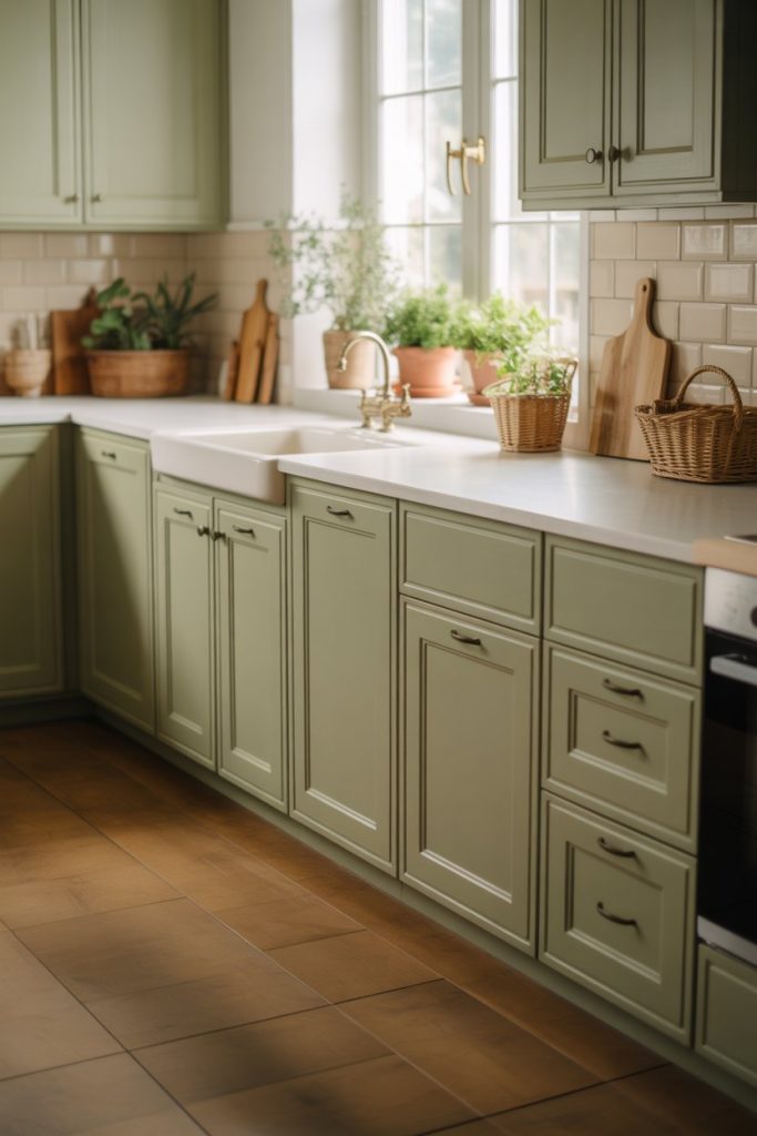 Light green cabinets above natural wood flooring creates a grounded, organic palette that brings the outside in. The wood adds warmth and texture that prevents light green from feeling too cool or spa-like, while the green keeps the space from skewing too brown or monotone. This combination is particularly popular in homes that embrace natural materials and earthy tones throughout—kitchens that feel connected to the rest of the home rather than designed in isolation. It’s a palette that ages gracefully as both materials develop character over time.
