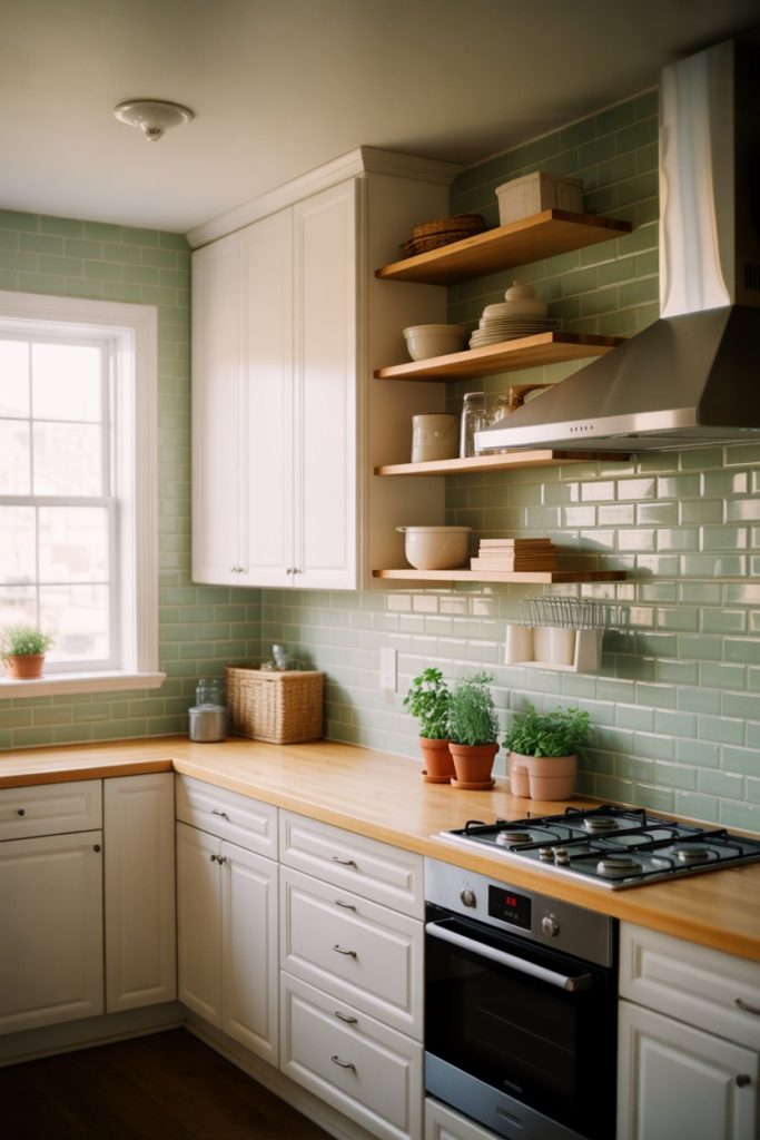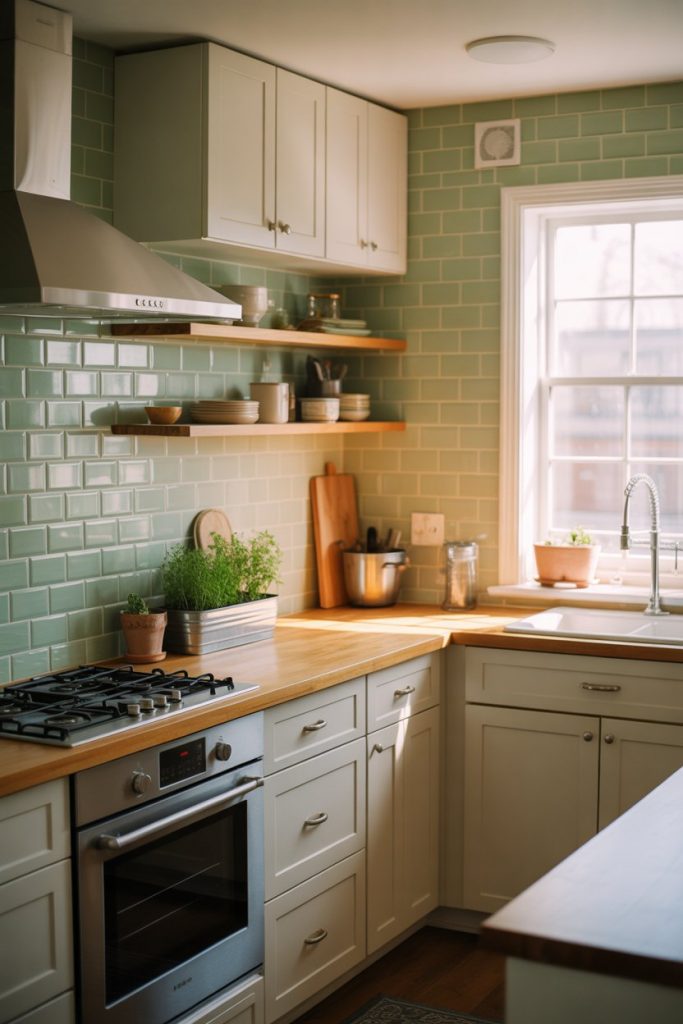 If you’re hesitant to commit to green cabinets, a pastel green backsplash offers the perfect compromise. Soft, almost minty tones bring color to eye level without dominating the space, creating a focal point that’s gentle rather than jarring. This approach works especially well in smaller kitchens where darker greens might close in the room. White cabinets keep things bright and airy, while the pastel tile adds personality and warmth that pure white alone can’t achieve.