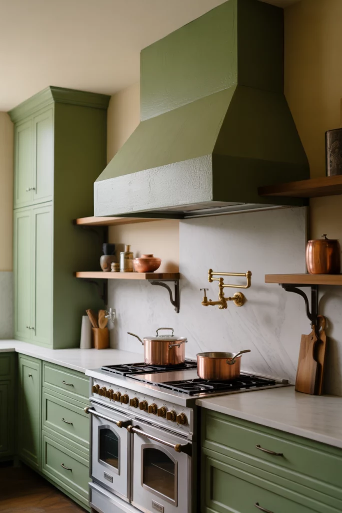 A custom range hood becomes sculpture when it’s executed in green or flanked by green cabinetry. Whether you paint the hood to match your cabinets or create contrast with a different material like plaster or wood, the range hood is the perfect place to make an architectural statement. In luxury kitchens, hoods often extend to the ceiling, creating dramatic vertical elements that draw the eye upward. In more modest spaces, even a simple painted hood can transform the kitchen’s focal point from appliance to design feature.