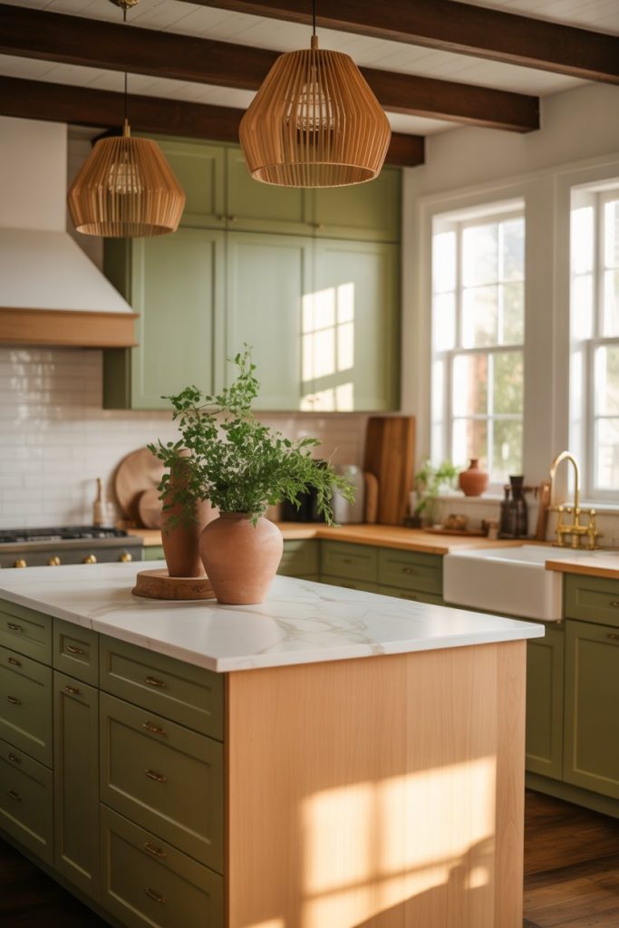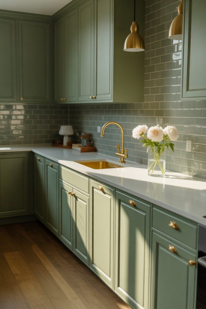 Light green cabinets paired with warm gold or brass fixtures create a kitchen that feels both elegant and approachable. The combination has roots in traditional design but feels fresh and current when executed with clean lines and contemporary proportions. This palette works beautifully in transitional homes—those that blend traditional architecture with modern amenities. The gold adds richness without the weight of darker metals, and it complements green’s natural undertones beautifully.
