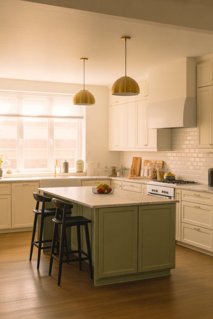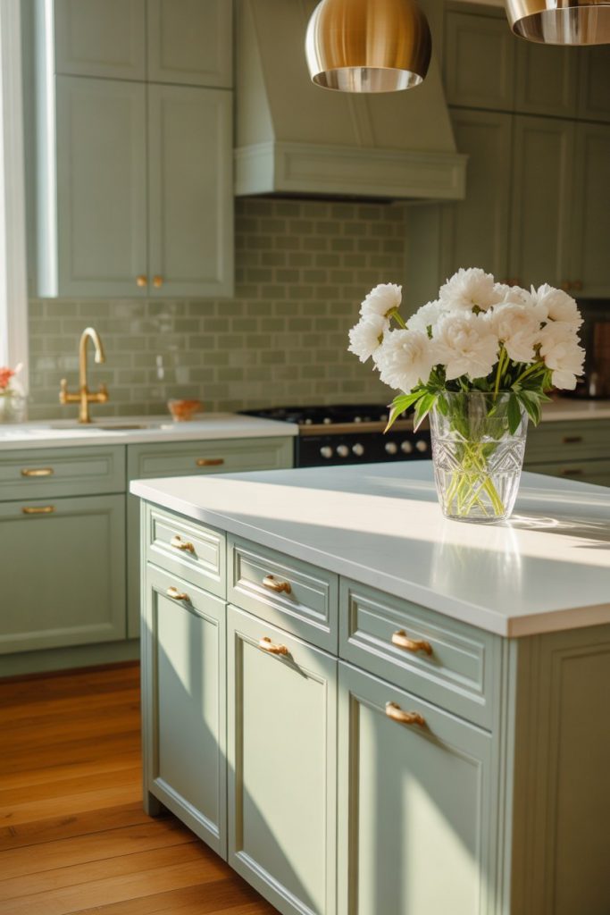 A sage green island against neutral perimeter cabinets creates instant architectural interest without the commitment of an all-green kitchen. This two-toned approach has become a favorite among designers because it defines zones in an open layout and adds depth that monochromatic kitchens lack. Sage is particularly forgiving—it reads sophisticated in traditional spaces and fresh in modern ones, making it a safe bet for resale value while still being on-trend.