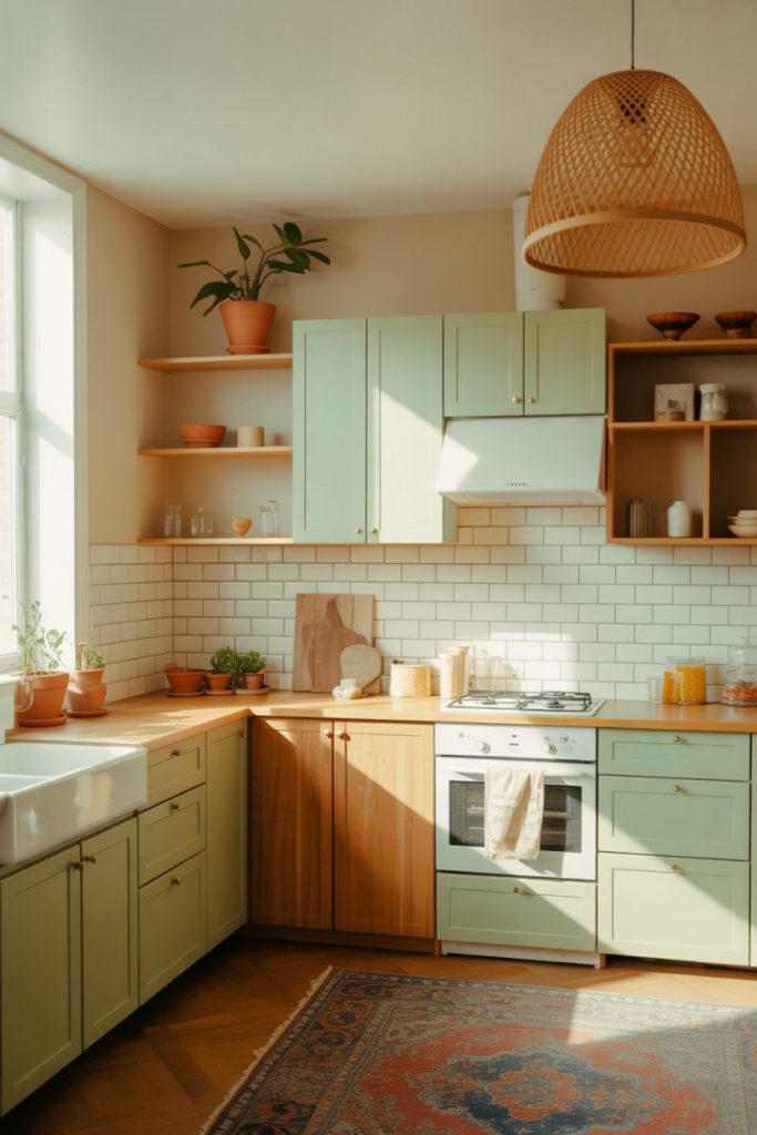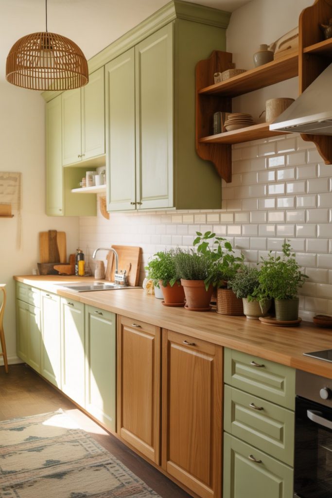 Pista green—a pale, warm shade named after the pistachio nut—brings unexpected freshness when used as accent color alongside natural wood cabinetry. Rather than painting all cabinets, consider pista on upper cabinets only, or on open shelving backing, allowing the warmth of wood to remain dominant. This creates a kitchen that feels organic and collected rather than designed, as if pieces were gathered over time. It’s particularly appealing in homes that embrace natural materials and earthy color palettes.