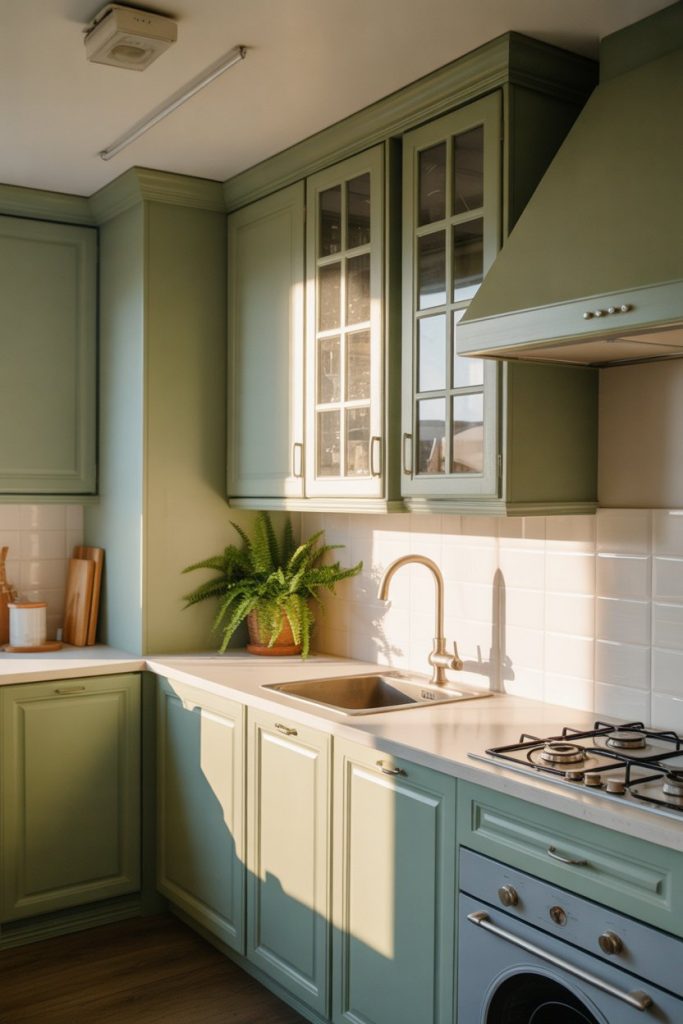 This style works particularly well in coastal communities along both coasts, where the light green echoes sea glass and beach vegetation. Common mistakes include choosing hardware that’s too ornate—stick with simple knobs and pulls in brushed nickel or chrome to maintain the modern, uncluttered feel. The beauty of this palette is its flexibility: it works with both warm and cool accent colors, allowing you to shift your kitchen’s mood seasonally with textiles, small appliances, and décor without ever repainting.