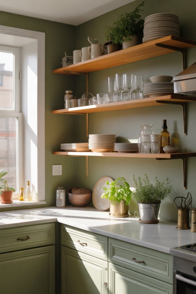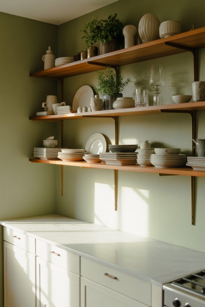 Open shelving has moved beyond trend into permanent fixture territory, and it’s particularly stunning in green kitchens. Whether you paint the wall behind the shelves in a complementary green or keep shelves themselves green while walls stay neutral, this approach creates visual interest and practical storage. The key is styling shelves thoughtfully—everyday dishes, glassware, and a few carefully chosen objects create a lived-in look. This is where green ideas meet practical function, proving beautiful kitchens can also be highly usable.
