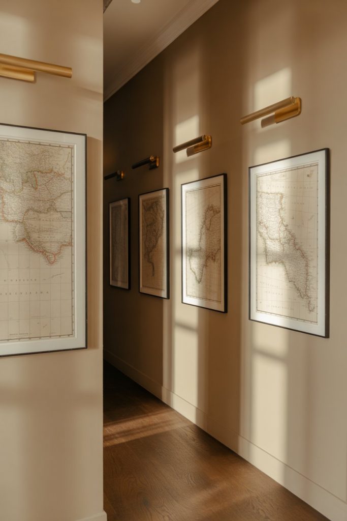 For history lovers and travelers, a collection of vintage maps brings both personality and conversation-starting detail to a hallway. This works beautifully in long corridors where you have the linear space to display multiple pieces in a row. Choose maps that reflect places you’ve lived or traveled, or go with a single region displayed across several frames for a cohesive narrative. The muted tones of aged paper pair well with both warm and cool wall colors.