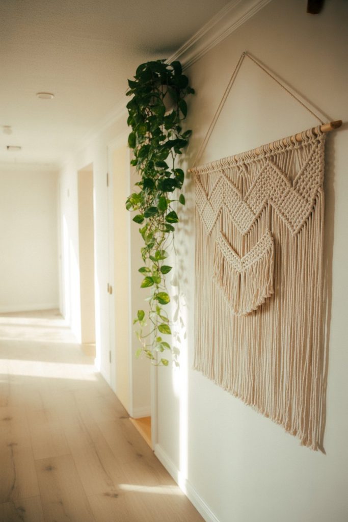 Bringing softness and organic texture, a large macramé piece paired with trailing plants like pothos or philodendron creates a calming, boho-inspired hallway. This style works best in homes with natural light, where the plants can thrive and the macramé’s intricate knotting is visible. In a narrow space, choose a vertical design that draws the eye upward rather than outward. The combination of fiber art and living greenery feels fresh and rooted in the current trend toward biophilic design.