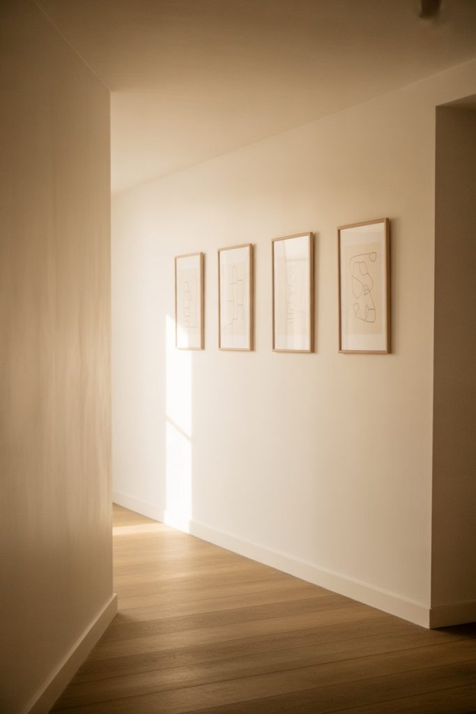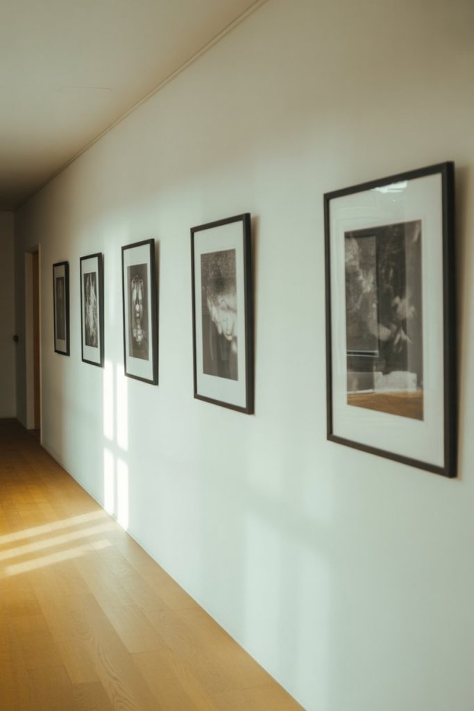 For a clean, contemporary look, minimalist line drawings in ultra-thin black or white frames bring sophistication without visual weight. This style is perfect for narrow or short hallways where you want decor that feels intentional but not overpowering. Choose simple subjects—faces, botanicals, abstract shapes—and keep the color palette neutral. The result is a hallway that feels curated and modern, with an art-gallery quality that elevates the entire space.