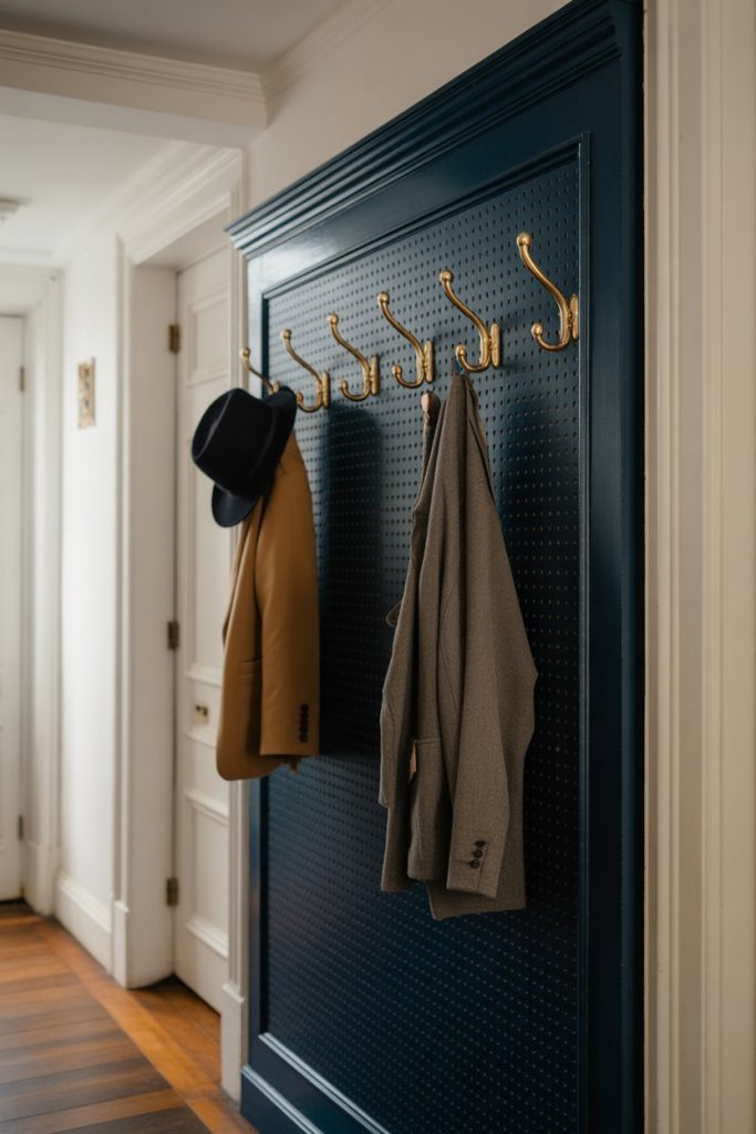 In a school or mudroom-adjacent hallway, a painted pegboard wall offers both function and visual interest. Use it to hang coats, bags, hats, or even small planters and keys. Choose a bold color like navy, forest green, or even black for a modern twist, or keep it neutral to blend with existing decor. The modular nature of pegboard means you can rearrange hooks and accessories as your needs change, making it one of the most adaptable hallway wall decor options.