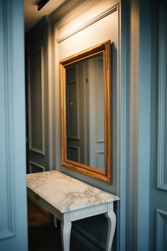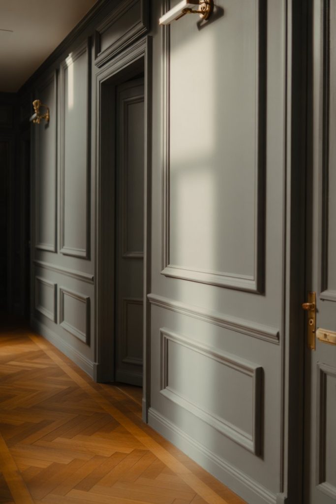 In homes with traditional architecture, adding decorative molding—think picture frame molding or wainscoting—and painting it a shade or two darker than the walls creates instant elegance. This works particularly well in entrance hallways or upstairs corridors in colonial or Victorian-style homes. The contrast adds dimension without requiring any additional decor, and it’s a classic look that never goes out of style. Pair it with a narrow console and a simple vase for a refined, understated effect.