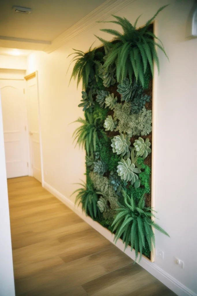 For homeowners committed to biophilic design, a vertical garden or living wall panel brings nature directly into the hallway. This is particularly striking in modern or minimalist spaces, where the greenery contrasts with clean lines and neutral tones. Small-scale systems are now available for residential use, featuring built-in irrigation and low-maintenance plants like ferns, succulents, or air plants. In a narrow hallway, this creates a lush focal point without taking up any floor space.