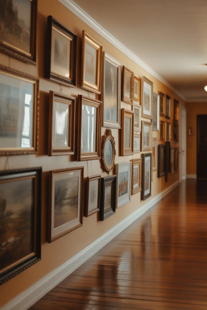A single large mirror with an ornate or antique-style frame can serve as a dramatic focal point in a short or entry hallway. This works especially well in traditional or transitional homes, where the decorative frame adds a sense of grandeur. Choose finishes like aged gold, distressed white, or carved wood to tie into your home’s existing aesthetic. The mirror itself brightens the space and creates the illusion of depth, making even the smallest hallway feel more open.