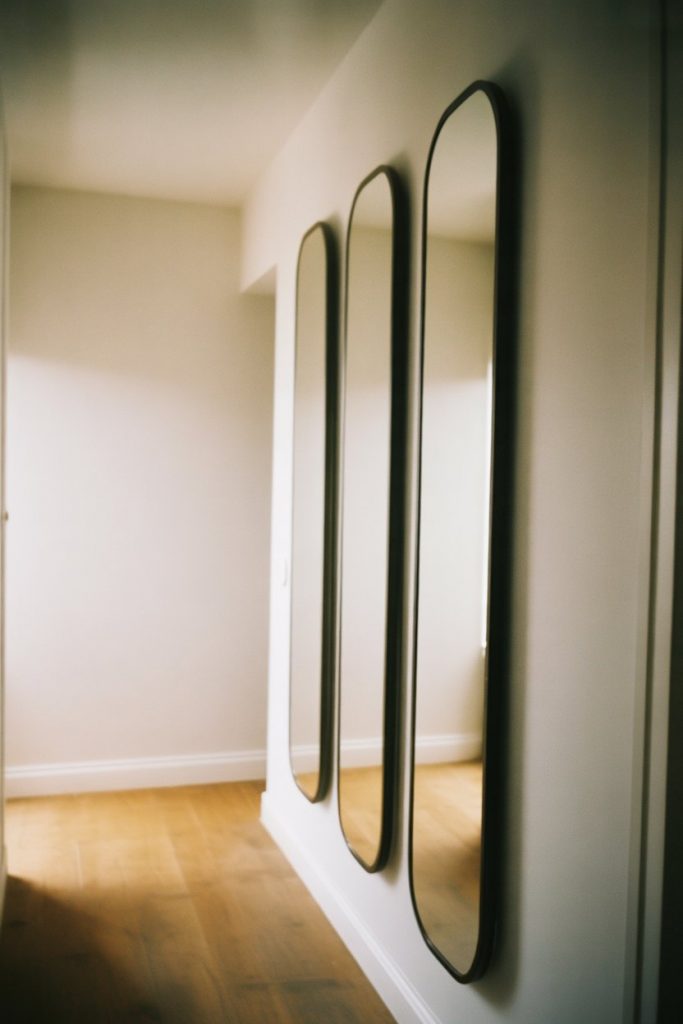 For tall or narrow hallways, a series of mirrors installed vertically can visually lift the ceiling and double the sense of space. This trick is especially effective in entry areas where natural light is limited. Choose mirrors with slim black or brass frames for a modern edge, or go frameless for a truly minimalist look. The reflective quality not only brightens the space but also creates an elegant rhythm as you move through it.