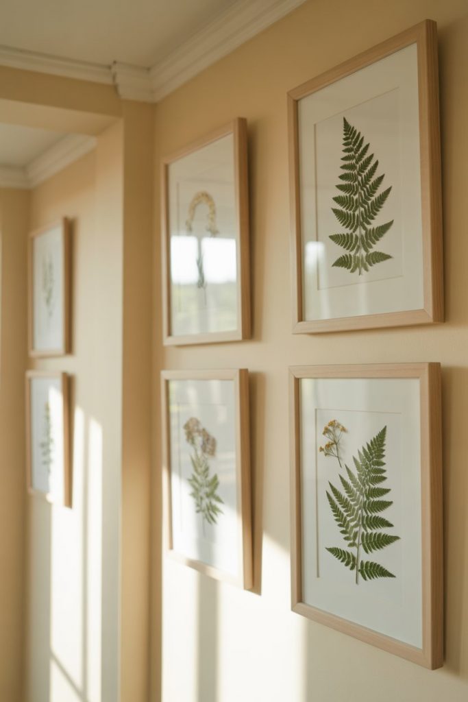 Real homeowner behavior: many people press their own botanicals from hikes or garden clippings, making this a deeply personal project. You can also purchase pre-pressed specimens online or from craft stores. The frames typically cost $15–$30 each, and the result is a timeless, elegant look that never feels dated. Just keep them out of direct sunlight to prevent fading over time.