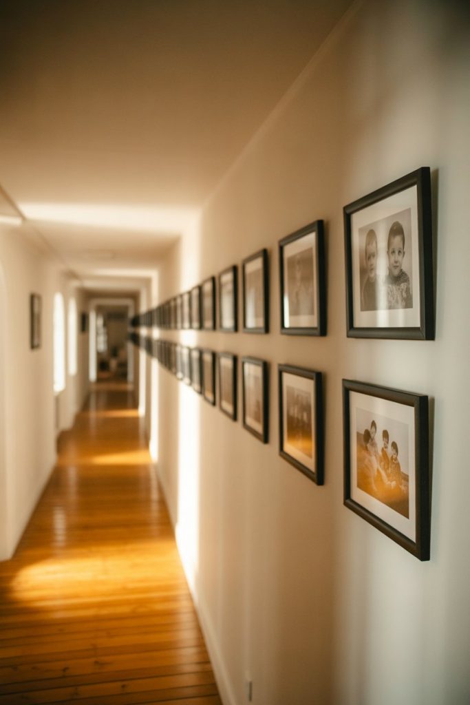 A chronological display of family photos—from wedding portraits to baby milestones to recent vacations—turns your hallway into a visual story. This is especially meaningful in entry or upstairs hallways, where family and guests naturally pass through. Use matching frames and keep the layout linear for a clean, organized feel. This approach works in any home style, from traditional to modern, and it’s endlessly customizable as your family grows and changes.
