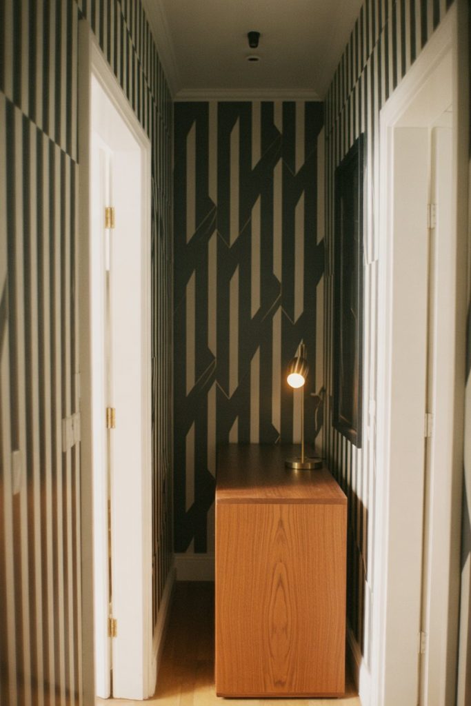 Sometimes the best hallway wall decor isn’t something you hang—it’s something you apply directly to the surface. A single accent wall covered in bold, patterned wallpaper can serve as the focal point in a short or narrow space, eliminating the need for additional art. Look for modern geometric prints, oversized florals, or abstract designs that reflect your personal style. This approach is particularly striking in entrance hallways, where it sets the tone for the rest of the home.