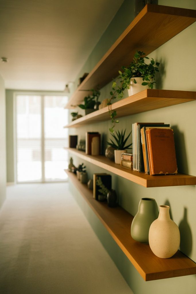 Functional and flexible, simple floating shelves offer a way to display seasonal decor, books, or small plants without committing to permanent wall art. In a long hallway, stagger shelves at different heights to create visual interest and break up the linear feel. This works especially well in boho or eclectic homes, where layering textures and personal objects is part of the aesthetic. Choose natural wood tones to keep things warm and inviting.