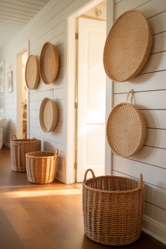 Bringing texture to a flat wall, woven baskets create a warm, organic look that’s perfect for boho or farmhouse hallways. Hang them in a cluster or a linear row along a narrow long space to add depth and visual rhythm. The natural materials—rattan, seagrass, jute—introduce an earthy element that contrasts beautifully with painted walls. This is one of the most tactile ways to decorate a hallway, and it feels especially fresh in 2026 as homeowners lean into handmade and artisan pieces.