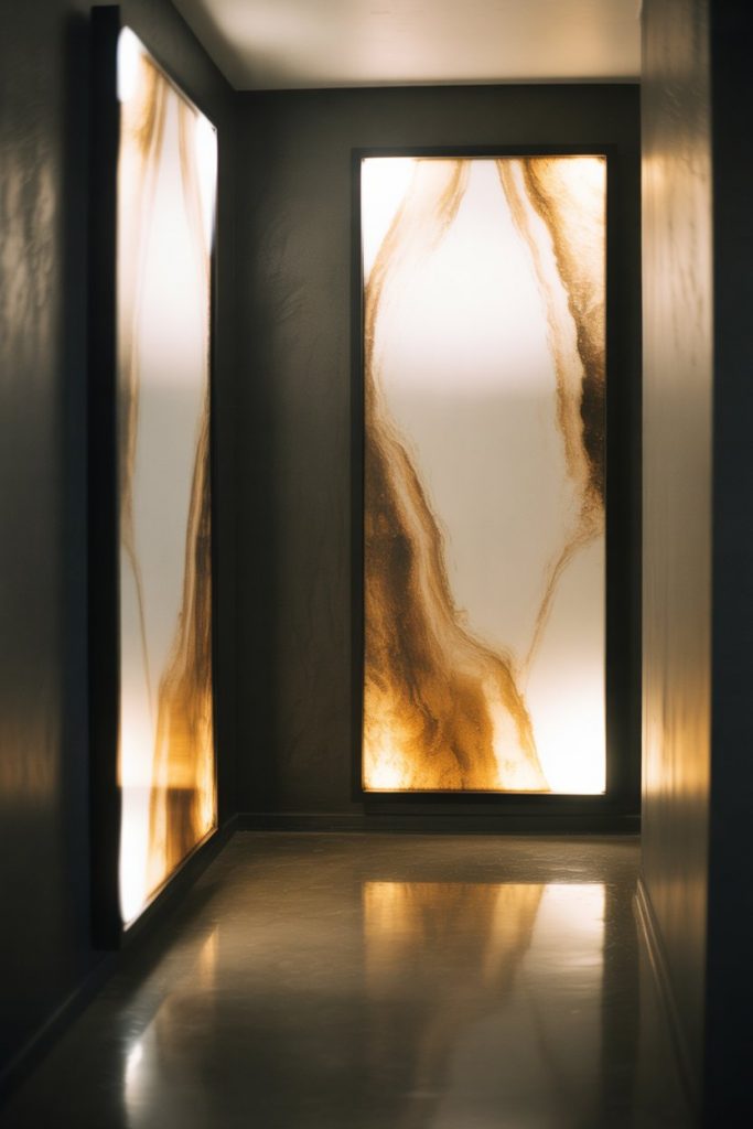 For a thoroughly modern and high-tech approach, consider backlit panels that double as both art and ambient lighting. These are especially effective in narrow hallways with little natural light, where they can illuminate the space while adding a sculptural element. Choose abstract designs, nature scenes, or even custom photography printed on translucent material. The soft glow creates a calming atmosphere and makes the hallway feel more intentional, especially in the evening.