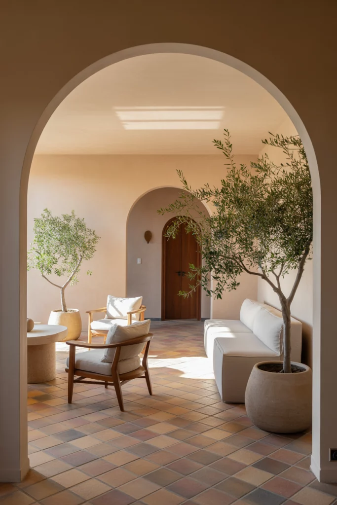 Modern Mediterranean style remains a 2026 trend for its timelessness. The balance of earthy textures and airy light is a hallmark of the modern Mediterranean look. Having oblique entryways, olive trees, and sun-drenched walls are some of the other defining characteristics. From Florida to the Amalfi Coast, designers are achieving a refined rustic modern elegance by reviving stucco and terracotta along with rustic modern elements.