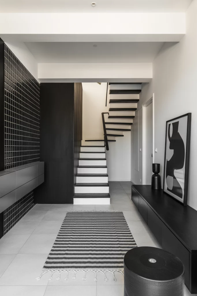 The timeless contrast of black and white becomes bolder through graphic tile, striped rugs, and oversized art. Perfect for living room small spaces and stairs ideas, the palette creates instant structure without visual noise. Designers say it’s the fastest way to look curated on a budget—like turning your home into a monochrome gallery.