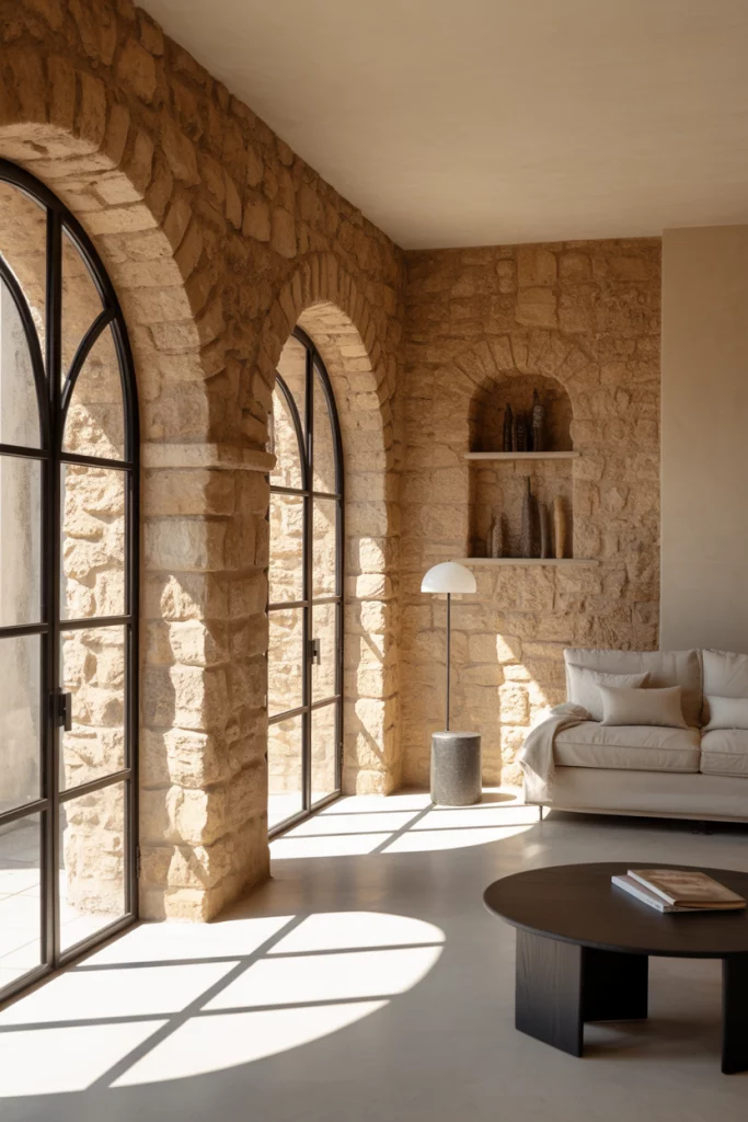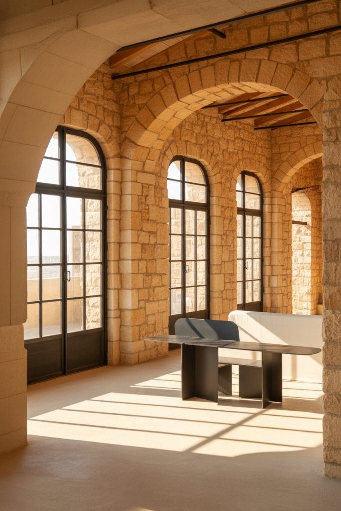 A new twist on Mediterranean design pairs ancient stone with sleek black steel frames. Arched openings meet industrial lines for a cinematic contrast. This works especially well in open lofts where softness and edge must coexist—heritage meets high-rise sophistication.