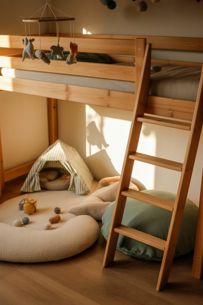 Elevating the bed creates a dual-purpose zone in a compact kids room, with the area underneath serving as a reading nook, art station, or even a mini playhouse. This layout is ideal for kids over six who can safely navigate a ladder and for rooms where maximizing vertical space is critical.
