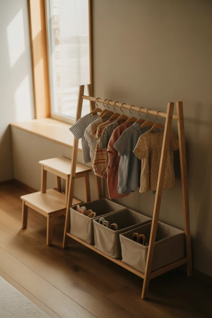 Replacing bulky dressers with open clothing racks and labeled bins encourages independence in a tidy kids room. Kids can see and access their clothes easily, which often leads to better self-dressing habits and less morning chaos. Choose low rods and baskets within arm’s reach for younger children.